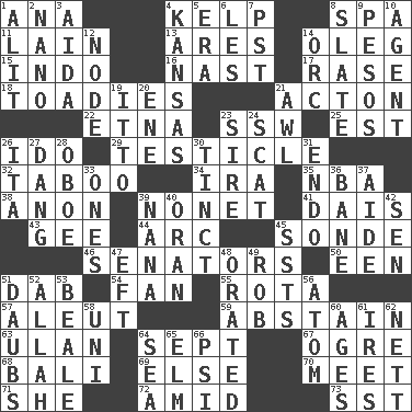 ACROSS 1. Santa ___, CA 4. Seaweed 8. Health resort 11. (Had) reclined 13. Ancient Greek god of war 14. Cassini of fashion 15. Southeast Asian peninsula 16. Political cartoonist Thomas 17. Raze (variant) 18. Sycophants 21. Gambison 22. Inactive volcano in Sicily 23. Compass dir. 25. Eastern Standard Time (abbr.) 26. Wedding promise 29. A testis 32. Off limits 34. Lyricist Gershwin 35. Basketball assoc. 38. At once, immediately (arch.) 39. Music written for nine 41. Raised platform 43. Turn to the right 44. Curve 45. Message 46. Legislators 50. Car or cant ending 51. Apply (a substance) by light strokes 54. Air blower 55. Roll call or roster of names 57. Native American of Southwest Alaska 59. Refrain by choice 63. ____ Bator 64. Back-to-school mo. 67. Legendary monster 68. Indonesian resort city 69. Otherwise 70. Confront 71. A female animal or person 72. Among 73. Fast jet (abbr.) DOWN 1. Came down and settled, as after flight 2. Billionth: prefix 3. Opera by Verdi 4. Sunflower state 5. Epoch 6. French article 7. Pacific Standard Time (abbr.) 8. Chalkboard 9. Mexican monetary units 10. Representative 12. Connecting point 14. The grampus (Milton) 19. "Tell ____ the Marines!" 20. Compass dir. 21. Leather borer 23. The founder of a family 24. Get outta here! 26. Call ___ day 27. Mild oath, euphamism for damn 28. Mitch Miller's instrument 30. A color or tint 31. Inside; within (prefix) 33. Washington bills 36. Object of repulsion 37. Helper 39. Grandmother 40. NW Algerian seaport 42. Elected rep. 45. Fast planes 47. Bank Draft (abbr.) 48. Declaimed 49. Director Reiner 51. Applies to a surface 52. Assad's deity 53. Calif. Air Force Base 56. Tiny particle 58. Single; one (prefix) 60. Grows older 61. Angers 62. Remaining after all deductions 64. Ocean 65. Shade tree 66. Air pressure measure (abbr.)