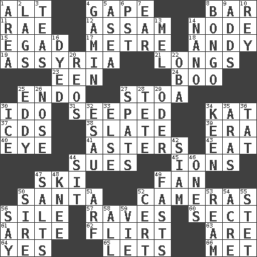 ACROSS 1. Keyboard modifier key 4. Yawn 8. Drinking establishment 11. Actress Charlotte 12. Indian state 14. Thickened enlargement 15. Mild oath 17. Distance measurement (Brit.) 18. Actor Griffith 19. Nineveh was its capital 21. Yearns 23. Car or cant ending 24. Sometimes accompanies a hiss 25. Inside; within (prefix) 27. Portico 30. Wedding promise 31. Oozed 34. Krazy ___ of comics 37. Music discs 38. Chalkboard 39. Epoch 40. Sight organ 41. Michaelmas daisies 43. Ingest 44. Takes to court 45. Charged atoms 47. What Jean-Claude Killy likes to do 49. Avid follower 50. Before Barbara or Clara 52. Devices for capturing images 56. Filth; sediment 57. All-night dance parties 60. Religious group 61. Johnson of "Laugh-In" 62. Seductive woman who exploits men 63. "We ___ not amused" (Victoria) 64. Affirmative reply 65. Allows 66. Was introduced to DOWN 1. Type of rug 2. Falls behind 3. Afternoon social gatherings 4. Street urchin 5. Toward the sea 6. Pacific Standard Time (abbr.) 7. Ewer handle 8. Beat drum 9. Sums up 10. Marina Del _, California 13. Cartoonist voice _ Blanc 14. Billionth: prefix 16. Colored 20. Vintage cars 22. Chief or king in Benin or Nigeria 25. Whirlpool 26. Characteristic smell of wine 27. Arguments over trivial matters 28. False hair 29. River in Europe 30. Frozen water 32. He sold his birthright 33. Otherwise 34. Peachy ____! 35. Ancient river in northeast Turkey 36. Make lace 42. Thailand, formerly 44. Be seated 46. Washington bills 47. Table seasonings 48. Leg joint 49. Goes without food and/or water 50. Title for a man of rank and authority 51. Sandy's bark 52. Certainty 53. 480, 500 or 516 sheets of paper 54. 1/640 square mile 55. Proofreading order 56. Declare 58. 100% 59. Compete