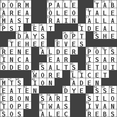 ACROSS 1. Dormintory (informal) 5. Diluted with white 9. Bar bill 12. Length times width 13. Butter sub 14. Falsehood 15. Vertical spar for supporting sails 16. Precipitation 17. Silent film actress Nazimova 18. Air pressure measure (abbr.) 19. Consume 21. Perfect 22. 24-hour periods 24. Choose 26. A female animal or person 27. Giggle 28. Nights before holidays 29. French philosopher Descartes 30. Tree or shrub in the Birch family 32. Plant holders 36. South American Indian 37. Ewer handle 38. Austrian river, tributary to the Danube 39. Wrote a lyric poem 40. Table seasonings 42. Needle holder 43. Had on 44. It is permitted: Lat. 46. Mountains (abbr.) 49. Electrically charged atom 50. An important port of Yemen 51. Eroded 53. Color 54. Compass dir. 57. Inky black, to poets 58. Indian skirt 61. Grain storage tower 62. Drink excessively 63. It was, poetically 64. _ the terrible 65. Mayday 66. Actor Baldwin 67. Confederate soldiers (slang) DOWN 1. Moist 2. Mouths or openings 3. Home 4. Floor covering 5. Sweet dark-red dessert wine 6. Insect wing 7. Luau accessory 8. Age 9. Lies 10. Assad's deity 11. Memphis, Tenn. Street 14. Bit 19. Sight organ 20. Toward the sea 21. ___ a Wonderful Life 23. At or in the front 24. Unconcealed 25. For each 27. Look after 28. Peak District village in England 29. River (Sp.) 31. Memorize 32. Part 33. Clearly or manifestly demonstrative 34. Strained 35. Indian title of respect (Mr.) 40. "Barney Miller" actor Jack 41. Kill 43. Victory 45. Binary compound 46. Confronts 47. Off limits 48. Ceases 52. Compass dir. 53. Compact _ 55. Broad, flat, thick piece 56. Immeasurably long periods of time 58. R.R. building 59. Leather borer 60. Actress Charlotte 61. Title for a knight