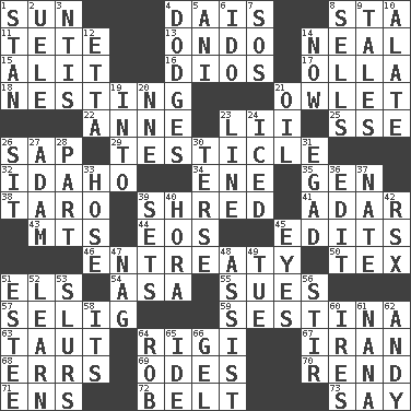 ACROSS 1. Player for Phoenix 4. Raised platform 8. R.R. building 11. False hair 13. Southwest Nigerian state 14. Be tempered by heat 15. Came down and settled, as after flight 16. "Vaya con ____" 17. Rounded earthenware pot or jar 18. Inhabiting a nest 21. A small or young owl 22. Singer Murray 23. Cards in a Roman deck? 25. Compass dir. 26. Plant excrement 29. One of the two male reproductive glands 32. Potato state 34. Compass dir. 35. Commissioned military rank (abbr.) 38. Pacific island yam 39. Fragment 41. The sixth month of the Jewish calendar 43. Mountains (abbr.) 44. Greek goddess of the dawn 45. Proofreads 46. Plea 50. John Ritter's dad 51. Raised railways 54. White ___ sheet 55. Institutes legal proceedings 57. Major League Baseball Commissioner Bud 59. French poetic form 63. Strained 64. Swiss mountan, "Queen of the Mountains" 67. SW Asia republic 68. Blunders 69. Lyric poems 70. Tear apart 71. Followers of ems 72. Waist strap 73. Declare DOWN 1. Comedian Laurel of Laurel & Hardy 2. Ubangi River tributary 3. Nuclear Threat Initiatives 4. Evades 5. Cuckoo 6. Wedding promise 7. Distress signal 8. Exchanges for money 9. Stories 10. Having winglike extensions 12. Singer James 14. Immediately 19. To the inside or interior of 20. Compass dir. 21. Petroleum 23. Actor's bit 24. On the rocks 26. Be seated 27. First man 28. Piece 30. Laconic 31. Mild oath 33. Stockings 36. Prepare for publication 37. Nathan's nickname 39. Arranges properly for use 40. Israeli folk dance 42. Acura sports coupe 45. Sight organs 47. Tired old horse 48. Help 49. Third day of the wk. 51. First name in cosmetics 52. Acquire or gain knowledge or skills 53. Runs notes together 56. Tumult 58. It is 60. Angers 61. Grandmother 62. "60 Minutes" Commentator Rooney 64. Director Reiner 65. Binary compound 66. Set