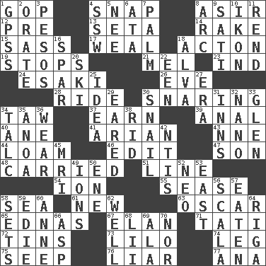 ACROSS 1. Republican Party 4. Fastener 8. SW Saudi Arabia district 12. Before (prefix) 13. Bristle 14. Immoral or dissolute person 15. Backtalk 17. Welt 18. Gambison 19. Constricts 21. Cartoonist voice _ Blanc 23. Working for oneself (abbr.) 24. 1973 Nobel Price Winner (Physics) Leo 26. Night before a holiday 28. Travel on an animal 30. Catching in a trap 34. The 23rd letter of the Hebrew alphabet 37. Merit 39. Of or related to the anus 40. One (Scot) 41. Believer in; advocate of (suffix) 43. Compass dir. 44. Rich soil 46. Prepare for publication 47. Boy, to dad 48. Borne 51. Actor's bit 54. Electrically charged atom 55. Gospel singer Marvin 58. Ocean 61. ___ Haven, CT 63. Motion picture award 65. Ferber et al. 67. Flair 71. Jacques of French films 72. Metal containers 73. _ and Stitch 74. Part of a journey 75. Ooze 76. One who doesn't tell the truth 77. Santa ___, CA DOWN 1. Global Positioning Systems (abbr.) 2. Declaim 3. Mexican monetary units 4. Compass dir. 5. Born 6. "One Day ___ Time" 7. Inside of hand 8. Curve 9. Suttee (variant) 10. Visual representation of an object 11. Tear apart 16. Coast Guard woman 18. Inventor's middle name 20. What Jean-Claude Killy likes to do 22. Car or cant ending 25. It may be bright or harebrained 27. Epoch 29. Having ears or earlike features 30. Slow-paced one 31. Lodging establishments 32. Billionth: prefix 33. Small, secluded valley 34. Baby powder 35. Small Philippine buffalo 36. Put on (as clothing) 38. To free from 42. Nuclear Threat Initiatives 45. Medical imaging device (abbr.) 49. Charged particles 50. Compass dir. 52. Modern: prefix 53. Compass direction 56. Any of the three canals of the cochlea 57. Consumed 58. Arranges properly for use 59. Singer Brickell 60. Singer Murray 62. Not ill 64. Capital of Latvia 66. Viper 68. Cards in a Roman deck? 69. Chicken ___ king 70. And not
