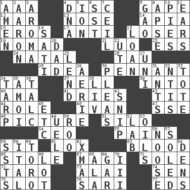 ACROSS 1. Auto club (abbr.) 4. Flat circle 8. Open wide 12. Impair 13. Olfactory organ 14. Capital of Western Samoa 15. Greek god of love 17. Against 18. Failure 19. Roamer 21. Nilotic language 23. Curvy letter 24. Relating to or accompanying birth 26. The 19th letter of the Greek alphabet 28. The content of cognition 30. Pre-World Series prize 34. Make lace 37. 1994 drama film starring Jodie Foster 39. To the inside or interior of 40. Nanny (var.) 41. Frees from moisture 43. Teat (slang) 44. Hero or heavy, e.g. 46. "Terrible" tsar 47. Compass dir. 48. Photo 51. Grain storage tower 54. Corporate head (abbr.) 55. Aches 58. Be seated 61. Brine-cured salmon 63. Vital fluid 65. Fur scarf 67. Wise men 71. Flatfish 72. Pacific island yam 73. Jai _ 74. Elected rep. 75. Notch 76. Indian skirt 77. Begley and Asner DOWN 1. So be it 2. Composer Copland 3. Scent 4. Heredity factor (abbr.) 5. Electrically charged atom 6. Fast jet (abbr.) 7. To provide with a ceiling 8. E Mali city 9. Domed church section 10. Sliced desserts 11. Hearing organs 16. Suttee (variant) 18. Grant temporary use of 20. Male parent 22. Shoshoni 25. Grant temporary use of 27. Single; one (prefix) 29. Nest on high 30. Entreaties 31. Pismires 32. Nuclear Threat Initiatives 33. Carryall 34. Canvas cover 35. Mine, in Marseilles 36. Baby powder 38. 54 in ancient Rome 42. Sever or remove by pinching or nipping 45. And so on (abbr.) 49. Ubangi River tributary 50. Friend of Pooh 52. Experiment locale 53. Lubricates 56. Trap for birds or small mammals 57. Having a sole or soles 58. Fast planes 59. Slanted text style (abbr.) 60. "Corrida" creature 62. Dec. holiday 64. Hiding places for outlaws 66. Car dealer's back yard 68. In the manner of 69. Slender fish 70. One more than two