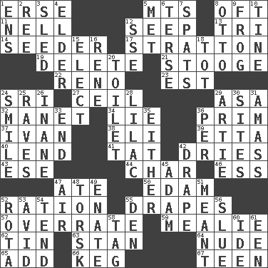ACROSS 1. Celtic language 5. Mountains (abbr.) 8. Often (poetically) 11. 1994 drama film starring Jodie Foster 12. Ooze 13. Three (prefix) 14. Sowing specialist 17. Ski resort town in Vermont 19. Erase 21. Moe Howard, for one 22. Former U.S. Attorney General Janet 23. Eastern Standard Time (abbr.) 24. _ Lanka 27. To provide with a ceiling 29. White ___ sheet 32. French painter Edouard 34. Whopper 36. Demure 37. "Terrible" tsar 38. Connecticut Ivy Leaguer 39. Singer James 40. Grant temporary use of 41. Make lace 42. Frees from moisture 43. Compass dir. 44. Burn to charcoal 46. Curvy letter 47. Had dinner 50. Dutch treat 52. Food allowance for one day 55. Window treatments 57. Make much ado about nothing 59. Ear of corn 62. Metal container 63. Comedian Laurel of Laurel & Hardy 64. Unadorned 65. Say or write further 66. Cask 67. Adolescent DOWN 1. Followers of ems 2. To separate or throw off 3. Downhill vehicle 4. A person who is older than you are 5. Was introduced to 6. Laconic 7. Arguments over trivial matters 8. "Beetle Bailey" pooch 9. Tree-dwelling hopper 10. Prong on a fork 12. Compass dir. 15. Opt 16. French philosopher Descartes 18. Small child 20. Bathroom plumbing fixture 24. Grin 25. All-night dance parties 26. Lacking in sense or substance 28. Pale purple color 29. Nick name for Arthur 30. Locates 31. Collect or gather 33. Conclude 35. One or the other 36. For each 42. Window treatment 45. First man 47. Atmosphere 48. Cod relative 49. Maternal 51. Intended 52. Round or rotation of duties 53. Enthusiastic 54. Watch over 55. Lair 56. Turn sharply 58. Label 60. Binary compound 61. Car or cant ending