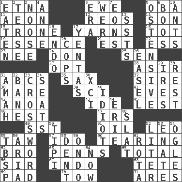 ACROSS 1. Inactive volcano in Sicily 5. She-sheep 8. Chief or king in Benin or Nigeria 11. Period of immesurable duration 12. Vintage cars 14. Male child 15. Heavy duty weighing machine 17. Entertaining tales 18. Small child 19. Center 21. Eastern Standard Time (abbr.) 22. Double-curved letter 23. Born 24. Spanish title 25. Elected rep. 27. Elect 28. SW Saudi Arabia district 31. Lettered men learn these first 35. Saxophone 37. Title for a man of rank and authority 38. Female horse 39. _-fi 41. Nights before holidays 42. Small Philippine buffalo 43. Binary compound 45. For fear that 46. Behest 47. Big collection agency 49. Fast jet (abbr.) 51. Lubricate 52. Lion 55. The 23rd letter of the Hebrew alphabet 57. Wedding promise 60. Rending 62. Sis' sibling 63. Actor Sean's family 65. "_____ Recall" 66. Title for a knight 67. Southeast Asian peninsula 68. Wig 69. Writing tablet 70. Pull behind 71. Ancient Greek god of war DOWN 1. Consumed 2. Laconic 3. Trap for birds or small mammals 4. Singer Murray 5. Period 6. We are 7. Immeasurably long periods of time 8. Clearly or manifestly demonstrative 9. Scornful sounds 10. Pismires 13. Fast planes 16. Inside; within (prefix) 17. Gossips 20. 911 reaches them 26. Artist's stand 29. Angers 30. Respite 31. Wet nurse 32. Object of repulsion 33. What you're doing now 34. Theater features 36. One more than ninety 40. Foolish or stupid persons 44. 4th largest of the Great Lakes 48. Narrow board 50. Native american tent (variation) 52. 61 cubic inches 53. Maternal 54. Stares at amorously 55. Cook's measure (abbr.) 56. Operatic vocal solo 58. Incision 59. Southwest Nigerian state 61. Roll call or roster of names 64. Immediately