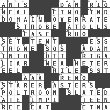 ACROSS 1. Pismires 5. One of the 12 tribes of Israel 8. _ de Janeiro 11. Actress Patricia 12. Fine (Spanish) 13. Working for oneself (abbr.) 14. Kingdom 17. Make much ado about nothing 19. Disco prop 21. Ringlike coral islands and reefs 22. Comfort 23. 17th letter of the Greek alphabet 24. Arrange properly for use 27. Portable shelter 29. Double-curved letter 32. Marketplace scale 34. Mayday 36. First of billions? 37. To the inside or interior of 38. Baseball player Mel 39. Port city in Latvia 40. One who doesn't tell the truth 41. Teachers' org. 42. Distance measurement 43. Snakelike fish 44. Cause heat under the collar 46. Fast jet (abbr.) 47. Auto club (abbr.) 50. San ____ (Riviera town) 52. A viewer who gazes fixedly 55. Michaelmas daisies 57. Coward 59. Scheduled 62. Had dinner 63. Body of Kaffir warriors 64. Adolescent 65. To separate or throw off 66. Erode 67. Inactive volcano in Sicily DOWN 1. Added to 2. Modern: prefix 3. Scottish caps 4. Schedule 5. HTML Container Element 6. Approach 7. _ pole 8. Monetary unit of Yemen 9. International (abbr.) 10. Lyric poems 12. Enemy 15. Feeling or showing extreme anger 16. Characteristic smell of wine 18. Friend of Pooh 20. Gillaume's butler role 24. Vertical member of a panel or frame 25. Bert's buddy 26. "_____ Recall" 28. Carrier 29. Prepares for publication 30. Gurus 31. Don Adams' spy role 33. And not 35. Flight of steps 36. "We ___ not amused" (Victoria) 42. Klaipeda city 45. Allows 47. Nonscientific branch of learning 48. Nest on high 49. Odor 51. Speak pompously 52. Coast Guard woman 53. Haul 54. Toward shelter 55. Black tropical American cuckoo 56. Proofreading order 58. Choose 60. Car or cant ending 61. Heredity factor (abbr.)