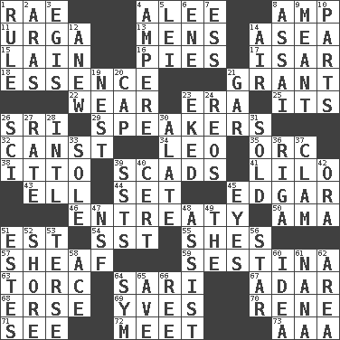 ACROSS 1. Actress Charlotte 4. Toward shelter 8. Electrical Unit 11. Capital and largest city of Mongolia 13. Not women's 14. Toward the sea 15. (Had) reclined 16. Sliced desserts 17. Austrian river, tributary to the Danube 18. Core 21. Let have 22. Put on (as clothing) 23. Period 25. It is 26. Indian title of respect (Mr.) 29. Orators 32. 2nd pers. sing. pres. of can (arch.) 34. Lion 35. The grampus (Milton) 38. "Tell ____ the Marines!" 39. Heaps 41. _ and Stitch 43. Pipe bend 44. Arrange properly for use 45. _ Allan Poe 46. Plea 50. Wet nurse (var.) 51. Eastern Standard Time (abbr.) 54. Fast jet (abbr.) 55. "______ My Girl" (Turtles hit) 57. To gather and bind into a bundle 59. French poetic form 63. Torque (variant) 64. Indian skirt 67. The sixth month of the Jewish calendar 68. Celtic language 69. Jacques Cousteau's middle name 70. French philosopher Descartes 71. Perceive with the eye 72. Rendezvous 73. Auto club (abbr.) DOWN 1. General guideline 2. Ancient river in northeast Turkey 3. The front part of a cuirass 4. Electrical Unit 5. Flowery wreath 6. Compass dir. 7. Curvy letter 8. Slender Brazilian palm 9. Intended 10. Pieces 12. Afresh 14. Wind 19. Egg locale 20. Head covering 21. Slender fish 23. Made supply last 24. Vintage cars 26. _-fi 27. Assign a rank or rating to 28. International (abbr.) 30. Having winglike extensions 31. Disposed of to a purchaser 33. Not divided or shared with others 36. Capital of Latvia 37. Dollar (slang) 39. Fast planes 40. Foregone conclusion 42. Mouth or opening 45. Sight organs 47. Science/research agcy. 48. Aid 49. Definite Article 51. _____ Park, CO 52. Dinah or Pauly 53. Laconic 56. Play the lead 58. Adept person 60. The main thing one is thinking about 61. Grandmother 62. Length times width 64. Symbol (abbr.) 65. "___ Maria" 66. Portuguese money of account (variant)