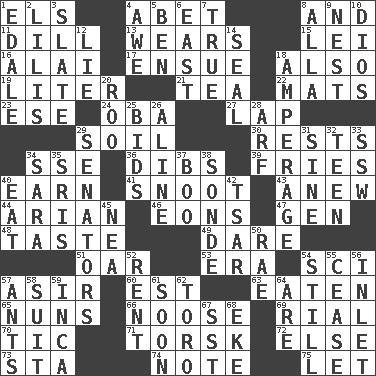 ACROSS 1. Raised railways 4. Collude with 8. Added to 11. Deli pickle 13. Puts on (as clothing) 15. Flowery wreath 16. Mountain range southwest of Kyrgyzstan 17. Take place subsequently 18. In addition 19. 61 cubic inches 21. Beverage made from leaves 22. Floor coverings 23. Compass dir. 24. Chief or king in Benin or Nigeria 27. Pet locale 29. Land 30. Musical pauses 34. Compass dir. 36. Rights 39. Strips of potato fried in deep fat 40. Merit 41. Snout, nose 43. Afresh 44. Believer in; advocate of (suffix) 46. Immeasurably long periods of time 47. Commissioned military rank (abbr.) 48. Clothes sense 49. Have the gumption 51. Boat paddle 53. Epoch 54. _-fi 57. SW Saudi Arabia district 60. Eastern Standard Time (abbr.) 63. Eroded 65. Religious women 66. Trap for birds or small mammals 69. Monetary unit of Yemen 70. Nervous spasm 71. Cod relative 72. Otherwise 73. R.R. building 74. Short letter 75. Allow DOWN 1. Peak District village in England 2. Ms. Damita and namesakes 3. Chalkboard 4. Deep reverence 5. Benjamin's nick name 6. 90 degrees 7. Loyal 8. Silent film actress Nazimova 9. A home for chicks 10. "Vaya con ____" 12. Whopper 14. Lick closed 18. Electrical Measurement 20. Friend of Pooh 25. Auction offers 26. Place in a line 28. Sandy's bark 29. Legislators 31. Trig term 32. Adolescent 33. Compass dir. 34. "Two Mules for Sister ____" 35. Indian titles of respect 37. Surprise greeting 38. Message 40. Consume 42. Russian ruler of old 45. Teachers' org. 50. Actress Charlotte 52. Monthly bill 54. Free of sound 55. Stop 56. An arm off of a larger body of water 57. Pismires 58. Costume for a special activity 59. South American Indian 61. Within a short period 62. "Corrida" creature 64. "We ___ not amused" (Victoria) 67. Fast jet (abbr.) 68. Make supply last