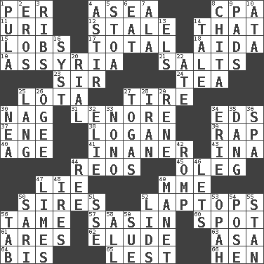ACROSS 1. For each 4. Toward the sea 8. Tax preparer (abbr.) 11. RI univ. 12. Showing deterioration from age 14. Not this but _ 15. Tennis shots 17. Add up to 18. Opera by Verdi 19. Nineveh was its capital 21. Table seasonings 23. Title for a knight 24. Afternoon social gathering 25. Globular water bottle used in Asia 27. Become fatigued 30. Tired old horse 31. Poe poem 34. Begley and Asner 37. Compass dir. 38. Utah city north of Ogden 39. Reproach for some lapse or misdeed 40. Grow older 41. More lacking in sense or substance 43. _ tizzy (2 wds.) 44. Vintage cars 45. Cassini of fashion 47. Untruth 49. Madame (abbr.) 50. Founders of families 52. Portable computers 56. Docile 57. Indian antelope 60. Blemish 61. Ancient Greek god of war 62. Evade 63. White ___ sheet 64. Twice 65. For fear that 66. Layer DOWN 1. Monetary unit of Botswana 2. Greek god of love 3. Chest bones 4. Having gotten out of bed 5. Portico 6. Erode 7. According to 8. Riviera of "Kiss of the Spider Woman" 9. Writing tablets 10. _ moment's notice (2 wds.) 13. Raised railways 14. Falsehood 16. System (abbr.) 20. Monetary unit of Yemen 22. Had dinner 25. Long (Scottish) 26. Double curve, resembling the letter S 27. Ancient Roman robes 28. SW Asia republic 29. French philosopher Descartes 30. Teachers' org. 32. Writer Wiesel 33. Words to Nanette 34. One of the Great Lakes 35. Mild oath, euphamism for damn 36. Health resort 42. Play 44. Portuguese money of account (variant) 46. Allows 47. Citrus fruits 48. Angers 49. French painter Edouard 50. Indian skirt 51. Compass dir. 52. Flaplike coverings 53. Brightly colored fish 54. Introduce or present, as a question 55. Comedian Laurel of Laurel & Hardy 56. Bar bill 58. Everything 59. Take to court