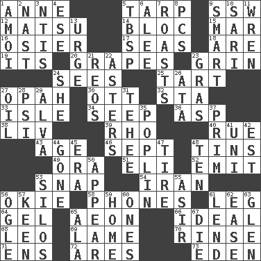 ACROSS 1. Queen of England 1702-14 5. Canvas cover 9. Compass dir. 12. Taiwanese island in East China Sea 14. Group of countries in special alliance 15. Third mo. 16. Flexible twig of a willow tree 17. Oceans 18. "We ___ not amused" (Victoria) 19. ___ a Wonderful Life 20. Raisin fruits 23. Smile widely 24. Perceives with the eye 25. Small pie 27. Brightly colored fish 30. Baseball player Mel 32. R.R. building 33. Capri or Wright 34. Ooze 36. Viper 38. 54 in ancient Rome 39. 17th letter of the Greek alphabet 40. Sorrow 43. Grow older 46. Back-to-school mo. 48. Airtight sealed metal containers 49. Mouth or opening 51. Connecticut Ivy Leaguer 52. Send forth 53. Fastener 54. SW Asia republic 56. Migrant worker of the '30s 58. Gives a jingle 61. Part of a journey 64. Set 65. A really long time 66. Standard of perfection 68. Lion 69. Unable to walk 70. Remove soap 71. Followers of ems 72. Ancient Greek god of war 73. Genesis locale DOWN 1. Mine, in Marseilles 2. Political cartoonist Thomas 3. Nuclear Threat Initiatives 4. Compass dir. 5. Cook's measure (abbr.) 6. Toward shelter 7. Cooks with dry heat, as in an oven 8. Personal Computers (abbr.) 9. Don Adams' spy role 10. Indian skirt 11. Songbird 13. Goad 21. Vintage cars 22. Michaelmas daisies 23. Pate de foie ____ 24. A female animal or person 26. _ moment's notice (2 wds.) 27. Lubricate 28. Air pressure measure (abbr.) 29. Inventor's middle name 31. Giggle 35. Cotton for raincoats, e.g. 37. Demure 41. Single; one (prefix) 42. Eastern Standard Time (abbr.) 44. Went 45. Period 47. Hoop that covers a wheel 48. Nine, plus one 50. Seem 53. Grain storage towers 55. SW Saudi Arabia district 56. Stare 57. Peachy ____! 59. Residence 60. Singles 61. Grant temporary use of 62. Relaxation 63. Small, secluded valley 65. In the manner of 67. Expire