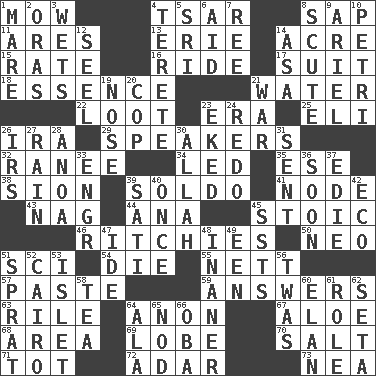 ACROSS 1. Cut the grass 4. Russian ruler of old 8. Plant excrement 11. Ancient Greek god of war 13. One of the Great Lakes 14. Land measure 15. Assign a rank or rating to 16. Travel on an animal 17. Set or collection 18. Core 21. Wetness 22. Spoils 23. Epoch 25. Biblical high priest 26. Lyricist Gershwin 29. Orators 32. The wife of a rajah (variant) 34. Directed 35. Compass dir. 38. The Jewish people; Israel 39. Twentieth part of a lira 41. Thickened enlargement 43. Tired old horse 44. Santa ___, CA 45. Unemotional 46. Actors Guy, Robert Welles, and Clint 50. Modern: prefix 51. _-fi 54. Expire 55. Remaining after all deductions 57. Thick mixture 59. Replies 63. Cause heat under the collar 64. At once, immediately (arch.) 67. _ vera 68. Type of rug 69. Ear part 70. Table seasoning 71. Small child 72. The sixth month of the Jewish calendar 73. Teachers' org. DOWN 1. Female horse 2. Mouths or openings 3. Soaks 4. Cylindrical with tapered ends 5. Indian title of respect (Mr.) 6. Assist 7. Portuguese money of account (variant) 8. Scutum 9. Satellite of Uranus 10. _ dish (used to culture cells) 12. Stitch closed the eyes of (a falcon) 14. White ___ sheet 19. Olfactory organ 20. Police officer (slang) 21. Armed conflict 23. Made supply last 24. Do over again 26. Big collection agency 27. Water falling in drops from the sky 28. Small Philippine buffalo 30. Assad's deity 31. Transmitted 33. Engineer (abbr.) 36. Within a short period 37. Singer Brickell 39. Suttee (variant) 40. Single time 42. Environmental prefix 45. Fast planes 47. Binary compound 48. More empty; more void 49. Car or cant ending 51. Small fatty European fish 52. Capital of Egypt 53. Small island 56. It was, poetically 58. Afternoon social gathering 60. Style 61. Hero or heavy, e.g. 62. Stalk of a moss capsule 64. In the manner of 65. Allow head to fall sleepily 66. Chief or king in Benin or Nigeria