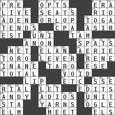 ACROSS 1. Before (prefix) 4. Chooses 8. Epoch 11. Not recorded 13. Theater features 15. To free from 16. Arabian gulf 17. Lowest deck of a ship 18. Ancient Roman robe 19. Watches over 21. Tax preparer (abbr.) 22. SW Saudi Arabia district 23. Eastern Standard Time (abbr.) 24. University (slang) 27. Scottish cap 29. At once, immediately (arch.) 30. Arguments over trivial matters 34. Fish or hair follower 36. Style 39. Nest on high 40. "Corrida" creature 41. Crowbar 43. French philosopher Descartes 44. Empty; void 46. Edible starchy tuberous root 47. Compass dir. 48. "_____ Recall" 49. Null 51. Mouth edge 53. And so on (abbr.) 54. Compass dir. 57. Monetary unit of Yemen 60. Allow 63. Proofreads 65. "60 Minutes" Commentator Rooney 66. Goodbye (Sp.) 69. A single undivided whole 70. R.R. building 71. Entertaining tales 72. Stare 73. Shade tree 74. Rendezvous 75. Raised railways DOWN 1. Food holder 2. Amusement-park features 3. Happening 4. Bear (Spanish) 5. For each 6. Baby powder 7. Constrict 8. Greek god of love 9. Swiss mountan, "Queen of the Mountains" 10. The sixth month of the Jewish calendar 12. Conclude 14. Petty quarrel 18. ________ with (broke a safety seal) 20. Player for Phoenix 25. Christmas carol 26. An arm off of a larger body of water 28. White ___ sheet 29. Without tonality 31. Ancient Greek god of war 32. Prong on a fork 33. Perceive with the eye 34. Words to Nanette 35. Part of Q.E.F. 37. Actress Gardner 38. Impudent aggressiveness 40. Teat (slang) 42. Carrot, for example 45. Biblical high priest 50. Frozen water 52. Shaw product 54. Burn superficially 55. Free of sound 56. _____ Park, CO 57. To erase 58. International (abbr.) 59. First man 61. Dutch treat 62. Become fatigued 64. Superhero pair 67. Single 68. Fast jet (abbr.)