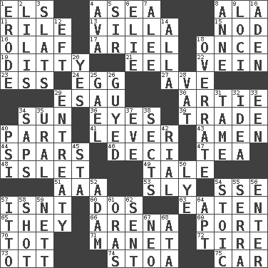 ACROSS 1. Raised railways 4. At sea 8. Wing 11. Cause heat under the collar 13. Country estate 15. Lower and raise head in agreement 16. Norwegian king 17. Satellite of Uranus 18. At one time in the past 19. Short, simple song 21. Snakelike fish 22. Distinctive style or manner 23. Curvy letter 24. Ovum 27. "___ Maria" 29. He sold his birthright 30. Nick name for Arthur 34. Player for Phoenix 36. Snake ____ (dice throw) 39. Barter 40. Piece 41. Crowbar 43. So be it 44. Practice fights 46. Tenth: prefix 47. Beverage made from leaves 48. Small island 49. Story 51. American Automobile Association (abbr.) 53. Wily 54. Compass dir. 57. Is not 60. Two (Sp.) 63. Ingested 65. Those things 66. Sports stadium 69. Sweet dark-red dessert wine 70. Small child 71. French painter Edouard 72. Hoop that covers a wheel 73. Baseball player Mel 74. Portico 75. 4-wheeled motor vehicle DOWN 1. Eat (away) 2. Ms. Damita and namesakes 3. Narrow boards 4. Actress Gardner 5. Title for a knight 6. Writer Wiesel 7. Toward shelter 8. Queen of England 1702-14 9. Locales 10. Arabian gulf 12. Lizard (obsolete) 14. Silent film actress Nazimova 18. Make much ado about nothing 20. Consenting reply 25. Highlander 26. Secured 28. Large container 29. Plea 31. Not wild 32. The content of cognition 33. Car or cant ending 34. Plant excrements 35. Mountain range 37. Night before a holiday 38. Religious groups 40. 23rd letter of the Greek alphabet 42. Monetary unit of Yemen 45. R.R. building 50. Sodium hydroxide 52. First man 54. Unemotional 55. Spanish missionary in California 56. Keyboard key 57. "Tell ____ the Marines!" 58. Guess 59. Remaining after all deductions 61. Mouths or openings 62. Transmitted 64. Fitting 67. Modern: prefix 68. "One Day ___ Time"