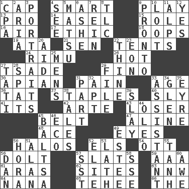 ACROSS 1. Head covering 4. Don Adams' spy role 9. Live dramatic performance 13. Adept person 14. Artist's stand 15. Hero or heavy, e.g. 16. Wind 17. Principle of right and wrong 18. I made a mistake 19. "One Day ___ Time" 21. Elected rep. 22. Portable shelters 24. Tall New Zealand timber tree 26. Being at a high temperature 27. Sadhe (variant) 29. Fine (Spanish) 30. Bee-related 31. Ache 33. Personal question 36. Make lace 37. Paper fasteners 40. Wily 41. ___ a Wonderful Life 42. Johnson of "Laugh-In" 43. Failure 45. Waist strap 47. Place in a line 48. Adept person 49. Sight organs 50. Auras 52. Raised railways 54. Baseball player Mel 56. Stupid person 57. Narrow boards 59. Auto club (abbr.) 61. Ancient river in northeast Turkey 62. Settings 63. Compass dir. 64. Nanny 65. Giggle 66. Definite Article DOWN 1. Tax preparer (abbr.) 2. Roberta Peters solo 3. Likenesses of persons 4. Perceive with the eye 5. Taiwanese island in East China Sea 6. American tennis player Robert 7. It's straight from the horse's mouth 8. Affectionate concern, for short 9. Right away 10. Plunder 11. High mountains 12. Consenting reply 20. Opera by Verdi 22. One or ones belonging to thee 23. Period of immesurable duration 25. Not women's 27. Jacques of French films 28. Argument over a trivial matter 29. Do some clerical work 31. Piece 32. Fitting 33. Helper 34. Small, secluded valley 35. Jane of fiction 38. Falsehoods 39. Kill 44. Butter sub 45. Greek mezzo-soprano Agnes 46. Environmental prefix 49. First name in cosmetics 50. Israeli folk dance 51. ____ Jay Lerner 52. Writer Wiesel 53. Thin strip of wood or metal 55. Hyperbolic tangent 56. One of the 12 tribes of Israel 57. Fast jet (abbr.) 58. Compass dir. 60. Deep reverence