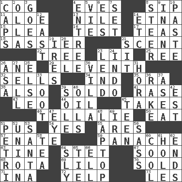ACROSS 1. Gear tooth 4. Nights before holidays 8. Small drink 11. Medicinal plant 13. The longest river in the world 14. Inactive volcano in Sicily 15. Entreaty 16. Trial 17. Afternoon social gatherings 18. More disrespectful 21. Odor 22. Woody plant 23. Cards in a Roman deck? 25. Portuguese money of account (variant) 26. One (Scot) 29. Veterans Day date 32. Makes a sale 34. Indiana (abbr.) 35. Mouth or opening 38. In addition 39. Twentieth part of a lira 41. Raze (variant) 43. Lion 44. Petroleum 45. Receives possession of 46. Copy Pinocchio 50. Erode 51. Festering 54. Affirmative reply 55. Ancient Greek god of war 57. Related on the mother's side 59. Flamboyance 63. Prong on a fork 64. Proofreading order 67. Within a short period 68. Round or rotation of duties 69. _ and Stitch 70. Disposed of to a purchaser 71. _ tizzy (2 wds.) 72. Sharp bark 73. French article DOWN 1. Balmoral and tarboosh 2. Water jar 3. Leaves 4. Main course 5. Compete 6. Raised railways 7. Put into a specified state 8. Bull 9. Empty; void 10. Thick mixture 12. 90 degrees 14. And so on (abbr.) 19. Angers 20. Snakelike fish 21. Be seated 23. Grant temporary use of 24. Southeast Asian peninsula 26. White ___ sheet 27. 1994 drama film starring Jodie Foster 28. Otherwise 30. Country estate 31. Israeli folk dance 33. Plunder 36. Immoral or dissolute person 37. At sea 39. Not divided or shared with others 40. Petroleums 42. Eastern Standard Time (abbr.) 45. Adolescent 47. Sight organ 48. Portable computer 49. Lyricist Gershwin 51. _ dish (used to culture cells) 52. The state of being joined or united 53. Before Barbara or Clara 56. Backtalk 58. Beverage made from leaves 60. Calm and collected 61. Opening into or through something 62. Conclusions 64. Stealthy 65. Make a knot 66. Pipe bend