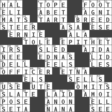 ACROSS 1. Actor Linden 4. Drink excessively 8. Pick up the tab 12. Biblical high priest 13. Collude with 14. Hindu god of fire 15. Floor coverings 17. Small pie 18. A special lineage 19. Guide 21. White ___ sheet 23. Compass dir. 24. Bert's buddy 26. Wing 28. Lacquered or enameled metalware 30. Curse 34. Big collection agency 37. Downhill vehicle 39. Opera by Verdi 40. Born 41. Ferber et al. 43. Hat (slang) 44. Small valley 46. Snakelike fish 47. French article 48. Person of authority 51. Inactive volcano in Sicily 54. Raised railways 55. Makes a sale 58. Purpose 61. Shoshoni 63. Leaves out 65. Schedule 67. Put down 71. Mine, in Marseilles 72. Airs 73. At once, immediately (arch.) 74. Pipe bend 75. Bristle 76. Nanny 77. Perceive with the eye DOWN 1. Cloth borders 2. Having winglike extensions 3. 61 cubic inches 4. Make lace 5. Chief or king in Benin or Nigeria 6. For each 7. Singer James 8. At a great distance 9. Double curve, resembling the letter S 10. Washington bills 11. Periodic rise and fall of the sea level 16. Emitted 18. Indonesian resort city 20. River (Sp.) 22. Plant excrement 25. Otherwise 27. _ moment's notice (2 wds.) 29. A person who is older than you are 30. Peak District village in England 31. Land elevation 32. Singer Brickell 33. Small boys 34. Southeast Asian peninsula 35. Coral ridge 36. Automatically 38. Compass dir. 42. Fast planes 45. Untruth 49. A slight indication 50. Eastern Standard Time (abbr.) 52. Modern: prefix 53. _ mater 56. Citrus fruits 57. Fur scarf 58. United States Postal Service (abbr.) 59. _ gin 60. 90 degrees 62. Enthusiasm 64. Drop; flow; fall 66. Beverage made from leaves 68. Santa ___, CA 69. Electrically charged atom 70. Heredity factor (abbr.)