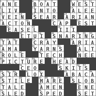 ACROSS 1. A saturated hydrocarbon 4. Water vessel 8. Compass direction 12. 54 in ancient Rome 13. To the inside or interior of 14. Toward shelter 15. Distinctive style or manner 17. Dry up 18. Believer in; advocate of (suffix) 19. Gambison 21. Head covering 23. Eastern Standard Time (abbr.) 24. Artist's stand 26. One more than two 28. Needle holder 30. Catching in a trap 34. Make lace 37. Supercomputer manufacturer 39. Operatic vocal solo 40. Nursemaid (var.) 41. Entertaining tales 43. The first octave above the treble staff 44. Hero or heavy, e.g. 46. Georgia ____ (Atlanta school) 47. Born 48. Photo 51. Froth on beer 54. Corporate head (abbr.) 55. Burlesque acts 58. Title for a knight 61. Brine-cured salmon 63. Phillipine bananalike plant 65. Vertical member of a panel or frame 67. Female horse 71. Messy guy 72. Lie 73. So be it 74. Compass dir. 75. Downhill vehicle 76. Hurried 77. Put into a specified state DOWN 1. Inventor's middle name 2. Sibling's daughter 3. Webber/Rice musical 4. Twice 5. Single 6. "One Day ___ Time" 7. Torque (variant) 8. Armed conflict 9. Writer Wiesel 10. Oceans 11. Portable shelter 16. Olfactory organ 18. Capital of Western Samoa 20. Fish or hair follower 22. The 18th letter of the Arabic alphabet 25. "I Love _" 27. Lyricist Gershwin 29. Feeling or showing extreme anger 30. Synchronize (abbr.) 31. SW Asia republic 32. The longest river in the world 33. Yard entry 34. Canvas cover 35. Mine, in Marseilles 36. Baby powder 38. "We ___ not amused" (Victoria) 42. "______ My Girl" (Turtles hit) 45. And so on (abbr.) 49. Ubangi River tributary 50. Friend of Pooh 52. Alias (abbr.) 53. Claim 56. Falsehoods 57. Biscuitlike quick bread 58. Fast planes 59. Slanted text style (abbr.) 60. Cause heat under the collar 62. Dec. holiday 64. Collude with 66. Directed 68. Electrical Unit 69. To separate or throw off 70. Conclude
