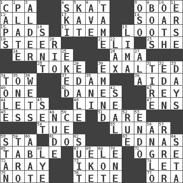ACROSS 1. Numbers guy (abbr.) 4. Three-handed card game 8. Mitch Miller's instrument 12. Everything 13. Polynesian shrub of the pepper family 14. Fly high 15. Writing tablets 17. Detail 18. Plunders 19. Bull 21. Biblical high priest 23. A female animal or person 24. Bert's buddy 26. Nursemaid (var.) 28. Puff or smoke 30. Honored 34. Pull behind 37. Dutch treat 39. Opera by Verdi 40. Single 41. Natives or inhabitants of Denmark 43. Marina Del _, California 44. Allows 46. Actor's bit 47. Followers of ems 48. Center 51. Have the gumption 54. Third day of the wk. 55. Type of eclipse 58. R.R. building 61. Two (Sp.) 63. Ferber et al. 65. Eating place 67. Ubangi River tributary 71. Legendary monster 72. Like ___ of sunshine 73. Image 74. Allow 75. Short letter 76. Wig 77. Mouth or opening DOWN 1. Smile enhancers 2. Food holder 3. Tree or shrub in the Birch family 4. What Jean-Claude Killy likes to do 5. Krazy ___ of comics 6. "___ Maria" 7. Not wild 8. Bear (Spanish) 9. Expressions of contempt or scorn 10. Pledge 11. Celtic language 16. Posted 18. Pale green bean 20. _ de Janeiro 22. Not strict 25. Supplemented with great effort 27. Wing 29. Peak District village in England 30. Make improvements or corrections to 31. Become fatigued 32. Locale of original sin 33. 24-hour periods 34. Lacquered or enameled metalware 35. Singles 36. Soaks 38. Cuckoo 42. Lick closed 45. Arrange properly for use 49. Naked 50. Corporate head (abbr.) 52. Regret 53. Inside; within (prefix) 56. White American of non-Hispanic descent 57. More uncommon 58. Comedian Laurel of Laurel & Hardy 59. Pacific island yam 60. Blind as ____ 62. Set of matching outer garments 64. Bristle 66. Sodium hydroxide 68. Supplement with great effort 69. Car dealer's back yard 70. Compass dir.