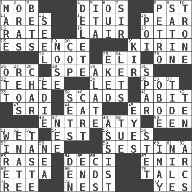 ACROSS 1. Crowd into 4. "Vaya con ____" 8. Pacific Standard Time (abbr.) 11. Ancient Greek god of war 13. Needle case 14. Lightbulb-shaped fruit 15. Pace 16. Den 17. "Beetle Bailey" pooch 18. Core 21. Japanese brewing company 22. Plunder 23. Biblical high priest 25. Single 26. The grampus (Milton) 29. Orators 32. Giggle 34. Allow 35. Cooking vessel 38. Frog relative 39. Large numbers or amounts 41. "This won't hurt ____!" 43. _ Lanka 44. Erode 45. Eat (away) 46. Plea 50. Car or cant ending 51. Dripping 54. Eastern Standard Time (abbr.) 55. Takes to court 57. Silly 59. French poetic form 63. Raze (variant) 64. Tenth: prefix 67. Independent ruler or chieftain 68. Singer James 69. Conclusions 70. Baby powder 71. To riddle 72. A home for chicks 73. It is so DOWN 1. Female horse 2. Mouths or openings 3. Stakes 4. Keyboard key 5. Call ___ day 6. Fr. "Yes" 7. Title for a knight 8. Stone: prefix 9. Smooth fabric 10. Marketplace scale 12. Sew up the eyelids of hawks and falcons 14. Luau course 19. Olfactory organ 20. Police officer (slang) 21. Apertif with cassis 23. Made supply last 24. Allows 26. Baseball player Mel 27. Vintage cars 28. Burn to charcoal 30. Having winglike extensions 31. Practice fight 33. Singer Brickell 36. Mitch Miller's instrument 37. Periodic rise and fall of the sea level 39. Arranges properly for use 40. Draw slowly or heavily 42. "___ Little Indians" 45. Snake ____ (dice throw) 47. Born 48. Help 49. Third day of the wk. 51. One who wires 52. Maternal 53. Clothes sense 56. Proofreading order 58. Teachers' org. 60. "If ____ say so..." 61. "Death on the ____" 62. Curves 64. Lair 65. Compass dir. 66. Music discs