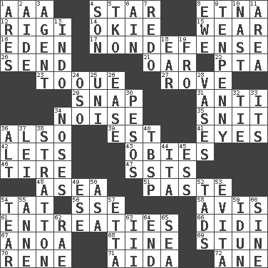 ACROSS 1. Auto club (abbr.) 4. Play the lead 8. Inactive volcano in Sicily 12. Swiss mountan, "Queen of the Mountains" 14. Migrant worker of the '30s 15. Put on (as clothing) 16. Locale of original sin 17. Unrelated to defense, as in spending 20. Transmit 21. Rowing implement 22. Parent Teacher Assoc. 23. Woman's close-fitting hat 27. Be footloose 29. Fastener 31. Against 34. Annoying sound 35. In a ____ (agitated or irritated) 36. In addition 39. Eastern Standard Time (abbr.) 41. Sight organs 42. Allows 43. Off-Broadway awards 46. Become fatigued 47. Fast planes 48. Toward the sea 51. Thick mixture 54. Make lace 56. Compass dir. 58. Opinion 61. Pleas 66. "You Light Up My Life" star Conn 67. Small Philippine buffalo 68. Prong on a fork 69. Astound 70. French philosopher Descartes 71. Opera by Verdi 72. A saturated hydrocarbon DOWN 1. Ancient Greek god of war 2. Helper 3. Rep 4. Manchild 5. Ring climax 6. The 18th letter of the Arabic alphabet 7. Redecorate 8. She-sheep 9. 3-inch nail 10. Political cartoonist Thomas 11. Type of rug 13. _ china 18. Ewer handle 19. Back 24. Bear (Spanish) 25. Corn or form start 26. Relaxation 28. Flower holders 30. Mexican monetary units 32. Neckwear 33. ___ a Wonderful Life 34. Olfactory organs 36. The first octave above the treble staff 37. Luau accessory 38. Ski resort town in Vermont 40. Cook's measure (abbr.) 44. Call ___ day 45. Double-curved letter 49. Compass dir. 50. White ___ sheet 52. Bits 53. Webber/Rice musical 54. Pull apart 55. Singer Murray 57. Singer James 59. Goddess of spring and wife of Bragi 60. Trig term 62. Actress Charlotte 63. One more than two 64. Conclude 65. Ocean