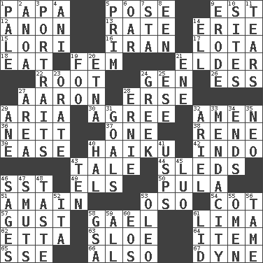 ACROSS 1. Dad 5. Introduce or present, as a question 9. Eastern Standard Time (abbr.) 12. At once, immediately (arch.) 13. Assign a rank or rating to 14. 4th largest of the Great Lakes 15. Australian parrot (variant) 16. SW Asia republic 17. Globular water bottle used in Asia 18. Ingest 19. Opposite of masc. 21. A person who is older than you are 22. Carrot, for example 24. Commissioned mil. rank 26. Curvy letter 27. Composer Copland 28. Celtic language 29. Roberta Peters solo 30. Match 32. So be it 36. Remaining after all deductions 37. Single 38. French philosopher Descartes 39. Relaxation 40. Japanese poetic form 42. Southeast Asian peninsula 43. Falsehood 44. Bobsleighs 46. Fast jet (abbr.) 49. Raised railways 50. Monetary unit of Botswana 51. At full speed 53. Bear (Spanish) 54. Small bed 57. Abrupt rush of wind 58. Highlander 61. Pale green bean 62. Singer James 63. _ gin 64. A distinct part 65. Compass dir. 66. In addition 67. Centimeter-gram-second unit of force DOWN 1. Diluted with white 2. Small Philippine buffalo 3. Likenesses of persons 4. Black tropical American cuckoo 5. Demure 6. Boat paddle 7. R.R. building 8. Car or cant ending 9. Eat (away) 10. Locates 11. Pulls apart 14. Pipe bend 19. Egg _ yung 20. Inactive volcano in Sicily 21. Compass dir. 23. Speak pompously 24. Of Greece 25. Compass dir. 27. Type of rug 28. Bert's buddy 29. A saturated hydrocarbon 31. Finish lines 32. Satellite of Uranus 33. Ananias' fault 34. Extremities 35. Modern: prefix 40. Actor Linden 41. United States Postal Service (abbr.) 43. Nine, plus one 45. Nilotic language 46. Gurus 47. Particles of soot 48. Clothes sense 52. Call ___ day 53. Butter sub 55. Sign of things to come 56. Not wild 58. Girls' org. (abbr.) 59. Everything 60. Greek goddess of the dawn 61. Flaplike covering