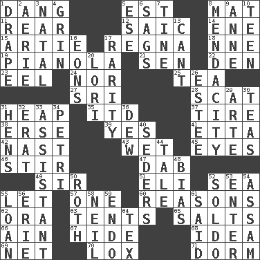 ACROSS 1. Mild oath, euphamism for damn 5. Eastern Standard Time (abbr.) 8. Floor protector 11. Buttocks 12. Ketch in the Levant 14. Compass dir. 15. Nick name for Arthur 17. Rain (Swedish) 18. Compass dir. 19. Player piano 21. Elected rep. 22. Lair 23. Snakelike fish 24. Or not 25. Beverage made from leaves 27. Indian title of respect (Mr.) 28. Jazz singing style 31. Pile 35. It would 37. Become fatigued 38. Celtic language 39. Affirmative reply 41. Singer James 42. Political cartoonist Thomas 43. Soggy 45. Snake ____ (dice throw) 46. Tumult 47. Pat or tap gently 49. Title for a knight 51. Connecticut Ivy Leaguer 52. Ocean 55. Allow 57. Single 60. Thinks logically 62. Mouth or opening 63. Portable shelters 65. Table seasonings 66. The 18th letter of the Arabic alphabet 67. Flintstone garb 68. The content of cognition 69. Fish or hair follower 70. Brine-cured salmon 71. Dormintory (informal) DOWN 1. Window treatment 2. Nest on high 3. Brizilian seaport 4. Smile widely 5. Compass dir. 6. Droops 7. Prong on a fork 8. Ananias' fault 9. Singer Murray 10. Adolescent 13. Patter 16. Immeasurably long periods of time 17. Noteworthy scarcity 20. Australian parrot (variant) 26. First name in cosmetics 29. Johnson of "Laugh-In" 30. Afternoon social gatherings 31. Coop moms 32. Part of Q.E.F. 33. Helper 34. _ dish (used to culture cells) 36. Morning condensation 40. Spring feasts 44. Lie 48. Prejudice 50. Writer of Portnoy's Complaint (1969) 52. Twentieth part of a lira 53. Keyboard key 54. Indian state 55. Grant temporary use of 56. 4th largest of the Great Lakes 58. Famous astronaut Armstrong 59. Inside; within (prefix) 61. Alleged 64. John Ritter's dad