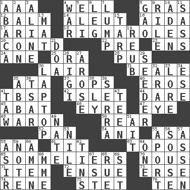 ACROSS 1. American Automobile Association (abbr.) 4. Not ill 8. Pate de foie ____ 12. Lip ointment 14. Eskimo relative 16. Opera by Verdi 17. Operatic vocal solo 18. Frustrating wastes of time 20. Continued (abbr.) 22. Before (prefix) 23. Followers of ems 24. One (Scot) 25. Mouth or opening 28. Purulenc 30. Den 31. Memphis, Tenn. Street 35. "One Day ___ Time" 37. Republicans 40. Greek god of love 41. Cook's measure (abbr.) 42. Small island 44. Have the gumption 45. Blind as ____ 46. Jane of fiction 47. Sight organ 48. Make _____ (do battle with) 50. Stern 52. Baking dish 54. Cuckoo 55. White ___ sheet 58. Santa ___, CA 61. Teat (slang) 63. Literary convention 65. Wine waiters 70. Horse sense 71. A distinct part 72. Follow as a consequence or result 73. Celtic language 74. French philosopher Descartes 75. Proofreading order 76. Nine, plus one DOWN 1. Phillipine bananalike plant 2. Composer Copland 3. Place in a line 4. Armed conflict 5. Connecticut Ivy Leaguer 6. Part of a journey 7. Mass 8. E Mali city 9. Cause heat under the collar 10. An important port of Yemen 11. Backtalk 13. Floor covering 15. Canvas cover 19. Reuben's nickname 21. ___ good deed 26. Swiss mountan, "Queen of the Mountains" 27. Came up 29. Sowing specialist 30. Portable computer 32. Like ___ of sunshine 33. Old wives' tales, e.g. 34. Compass dir. 35. Swedish rock group 36. Russian ruler of old 38. Apply oneself diligently 39. Father Junipero _ 41. The 23rd letter of the Hebrew alphabet 43. Adolescent 49. Nathan's nickname 51. Small island 53. The longest river in the world 55. To the left, to Queeg 56. Lush 57. NE Netherlands city 58. SW Saudi Arabia district 59. Brief written record 60. So be it 62. Airtight sealed metal containers 64. Single 66. Madame (abbr.) 67. Eastern Standard Time (abbr.) 68. Sorrow 69. Arrange properly for use