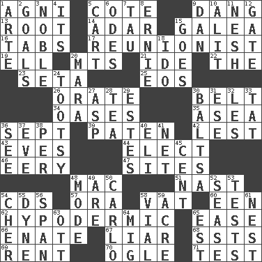 ACROSS 1. Hindu god of fire 5. ____ d'Azur (French Riviera) 9. Mild oath, euphamism for damn 13. Carrot, for example 14. The sixth month of the Jewish calendar 15. An organ shaped like a helmet 16. Bar bills 17. One who advocates reunion 19. Pipe bend 20. Mountains (abbr.) 21. Binary compound 22. Definite Article 23. Stalk of a moss capsule 25. Greek goddess of the dawn 26. Declaim 30. Waist strap 34. Fertile tracts in a desert 35. At sea 36. Back-to-school mo. 39. Eucharist need 42. For fear that 43. Nights before holidays 44. Choose 46. Suggestive of the supernatural 47. Locates 48. Apple computer (short form) 51. Political cartoonist Thomas 54. Music discs 57. Mouth or opening 58. Large container 60. Car or cant ending 62. Below the epidermis 65. Comfort 66. Related on the mother's side 67. One who doesn't tell the truth 68. Fast planes 69. Monthly bill 70. Stare at amorously 71. Trial DOWN 1. Johnson of "Laugh-In" 2. Scores awarded for successful feats 3. Having high moral qualities 4. It is 5. Draw slowly or heavily 6. Lyric poems 7. The 19th letter of the Greek alphabet 8. Bert's buddy 9. Daniel's nick name 10. Set down 11. Delicate 12. Yard entry 15. Moves 18. Wedding promise 20. Hindu Mythology: god of death 24. Tootsie (variant) 27. Viper 28. Afternoon social gathering 29. _____ Park, CO 30. Greek mezzo-soprano Agnes 31. Compass dir. 32. French article 33. Make lace 36. Perceive with the eye 37. First lady 38. For each 40. Connecticut Ivy Leaguer 41. Fish or hair follower 45. Penny 48. Method 49. "We ___ not amused" (Victoria) 50. Monte _, Las Vegas Hotel/Casino 52. Gospel singer Marvin 53. Trials 54. "Mermaids" star 55. Unit of force 56. Connect, as a bridge 58. Small bottle 59. Measure of real estate 61. Egg locale 63. Baseball player Mel 64. Russian fighter aircraft 65. Eastern Standard Time (abbr.)