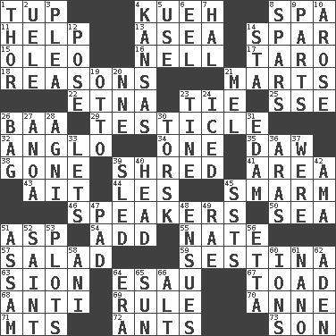 ACROSS 1. Uncastrated adult male sheep 4. Malaysian steamed pastry 8. Health resort 11. Aid 13. At sea 14. Practice fight 15. Butter sub 16. 1994 drama film starring Jodie Foster 17. Edible starchy tuberous root 18. Thinks logically 21. Shops 22. Inactive volcano in Sicily 23. Standoff 25. Compass dir. 26. Sound made by sheep 29. A testis 32. White American of non-Hispanic descent 34. Single 35. Obsolete 38. Went 39. Tear up 41. Type of rug 43. Small island 44. French article 45. Excessive but superficial compliments 46. Orators 50. Ocean 51. Cleo's killer 54. Say or write further 55. Nathan's nickname 57. First course 59. French poetic form 63. The Jewish people; Israel 64. He sold his birthright 67. Frog relative 68. Opposed to 69. Court order 70. Queen of England 1702-14 71. Mountains (abbr.) 72. Pismires 73. Male child DOWN 1. Son of Odin 2. Ubangi River tributary 3. Entreaty 4. Sunflower state 5. Purpose 6. Snakelike fish 7. Actor Linden 8. Practice fights 9. Pieces 10. Came up 12. Airs 14. R.R. building 19. Von Bismarck 20. Compass dir. 21. Cartoonist voice _ Blanc 23. Prong on a fork 24. On the rocks 26. Paper or plastic container 27. Small Philippine buffalo 28. Hindu god of fire 30. Cod relative 31. Dutch treat 33. Allows 36. Caspian sea tributary 37. We are 39. Downhill vehicle 40. Froth on beer 42. Nanny (var.) 45. Fast planes 47. Writing tablet 48. Takes place subsequently 49. Actress Charlotte 51. Indian state 52. Virtuous person 53. Small pieces of grounds 56. Singer James 58. Cuckoo 60. Charged atoms 61. Billionth: prefix 62. An important port of Yemen 64. Epoch 65. Player for Phoenix 66. The first octave above the treble staff