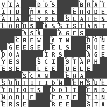 ACROSS 1. By way of 4. Two (Sp.) 7. Naughty child 11. It would 12. Cause to be 13. Wear away 14. _ moment's notice (2 wds.) 15. Jane of fiction 16. Chalkboards 17. Nobles 19. Helper 21. White ___ sheet 23. Grows older 24. Ship's personnel 25. The 18th letter of the Arabic alphabet 26. Spanish title 29. Honkers 30. Raised railways 31. Sorrow 32. ___ good deed 33. Big collection agency 34. Ripen 35. It is so 36. _-fi 37. Staphylococcus 40. Compass dir. 41. Area sheltered from the wind 42. Ubangi River tributary 43. Skim 45. Epoch 46. Casting lots 51. Take place subsequently 55. Foolish or stupid persons 56. Dunce 58. Conclude 59. Impressive in appearance 60. Singer Brickell 61. Metal container 62. Celtic language 63. To sift 64. R.R. building DOWN 1. Small bottle 2. "Tell ____ the Marines!" 3. The sixth month of the Jewish calendar 4. 24 hours 5. Gumbo ingredient 6. Perceives with the eye 7. Naughty children 8. Round or rotation of duties 9. Arabian gulf 10. Trial 12. Makes clutter 13. Otherwise 16. Signals 18. Have the gumption 20. Travel by water 22. Deep reverence 24. Desist 25. Nest on high 26. Window treatment 27. Ending for "Through" and "Enough" 28. Born 29. Travels 32. Color 33. Ancient Celtic tribe of eastern Britain 36. Narrow boards 37. Take to court 38. Cylindrical with tapered ends 39. ____ Jay Lerner 43. Took without asking 44. Quote 46. Trig term 47. Scent 48. Teases 49. River in Europe 50. Thickened enlargement 52. Puts into a specified state 53. A single undivided whole 54. Pulitzer Prize-winning author Ferber 57. Falsehood