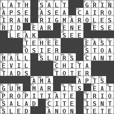 ACROSS 1. Thin strip of wood or metal 5. Table seasoning 9. Broad smile 13. Domed church section 14. At sea 15. Capital of Egypt 16. SW Asia republic 17. Frustrating wastes of time 19. To free from 20. Hearing organ 21. Compass dir. 22. Compass dir. 23. Path through which fluid escapes 25. Observe 26. Giggle 30. 90 degrees 34. Flexible twig of a willow tree 35. Portico 36. Promenade 39. Plays smoothly or legato 42. Patter 43. Morally bad or wrong 44. Riviera of "Kiss of the Spider Woman" 46. Bits 47. Carrier 48. Nanny (var.) 51. Flats, for short 54. Chewing product 57. Make imperfect 58. ___ a Wonderful Life 60. Erode 62. Appease 65. Musical group of three 66. First course 67. Quote 68. Is not 69. Downhill vehicle 70. At once, immediately (arch.) 71. Wig DOWN 1. Den 2. Showery time 3. Sadhe (variant) 4. Layer 5. "Two Mules for Sister ____" 6. SW Saudi Arabia district 7. Part of a journey 8. Domesticates 9. E Mali city 10. Cause heat under the collar 11. Angers 12. Characteristic smell of wine 15. Algonquian 18. A saturated hydrocarbon 20. Makes supply last 24. Ringlike coral islands and reefs 27. Part of HMS, perhaps 28. Snakelike fish 29. Spew [out] 30. Fortification 31. "One Day ___ Time" 32. Male offspring 33. Make lace 36. Was introduced to 37. Actress Gardner 38. Hat (slang) 40. 17th letter of the Greek alphabet 41. Be seated 45. Beverages made from leaves 48. Among 49. Floor protector 50. N. Chile seaport 52. Laconic 53. Virtuous person 54. Global Positioning Systems (abbr.) 55. Mountain range 56. Undercover agent 58. "Tell ____ the Marines!" 59. Adolescent 61. Carry 63. Groovy apt. 64. The 18th letter of the Arabic alphabet 65. Teat (slang)