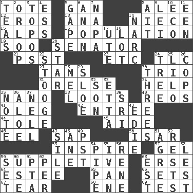 ACROSS 1. Carryall 5. Separate the seeds from cotton 8. Toward shelter 12. Greek god of love 13. Santa ___, CA 14. Sibling's daughter 15. High mountains 16. Census information 19. "Barney Miller" actor Jack 20. Elected representative 21. Inconspicuous attention getter 23. And so on (abbr.) 24. Affectionate concern, for short 27. Scottish caps 30. Musical group of three 31. Threatening words 34. Aid 35. Billionth: prefix 38. Plunders 40. Vintage cars 41. Cassini of fashion 42. Main course 44. Lacquered or enameled metalware 45. Assistant 46. Snakelike fish 47. Plant excrement 50. Austrian river, tributary to the Danube 53. Motivate 57. Set 59. Supplementary 63. Celtic language 64. First name in cosmetics 65. Baking dish 66. Arranges properly for use 67. Pull into pieces 68. Compass dir. 69. Trial DOWN 1. Afternoon social gatherings 2. Fourth or lowest deck 3. Traditional theme or motif 4. Double-curved letter 5. Open wide 6. At once, immediately (arch.) 7. California wine valley 8. Small island 9. Luau accessory 10. Environmental prefix 11. Car or cant ending 14. Drug cop 17. Shoshoni 18. Car dealer's back yard 20. Play the lead 22. Moe Howard, for one 24. Relationship diagram 25. _ and Stitch 26. 911 reaches them 28. Cartoonist voice _ Blanc 29. A type of plum 30. Triplets 32. Boy, to dad 33. Singer James 35. Short letter 36. _ vera 37. 1994 drama film starring Jodie Foster 39. _ Lanka 43. Singer Brickell 47. Drop; flow; fall 48. A saturated hydrocarbon 49. Pacific Standard Time (abbr.) 51. Match 52. Musical pauses 54. Corncob 55. _ the terrible 56. French philosopher Descartes 58. For fear that 59. Put into a specified state 60. Purpose 61. Parent Teacher Assoc. 62. For each 63. Eastern Standard Time (abbr.)