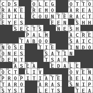 ACROSS 1. Music discs 4. Cassini of fashion 8. Von Bismarck 12. Immoral or dissolute person 14. San ____ (Riviera town) 15. Length times width 16. Tending to cause great harm 17. Neutralize 20. Sight organs 21. Car or cant ending 22. Quiet! 23. Religious groups 27. Delicate 29. Inside of hand 31. Land measure 34. Off limits 35. Ketch in the Levant 36. Olfactory organ 39. Neckwear 41. _ china 42. Washington bills 43. Smooth fabric 46. Scratch 47. Russian ruler of old 48. At sea 51. Peak District village in England 54. Sep. follower 56. 54 in ancient Rome 58. Baking chamber 61. Conciliate 66. Actor Lugosi 67. Pacific island yam 68. Caspian sea tributary 69. Clip 70. System (abbr.) 71. Allows 72. Beverage made from leaves DOWN 1. Algonquian 2. American folk hero Crockett 3. Atmospheres 4. The grampus (Milton) 5. Lion 6. Australian flightless bird 7. Went 8. Boat paddle 9. File 13 10. Technical 11. Pledge 13. Otherwise 18. Nine, plus one 19. Compass dir. 24. Numbers guy (abbr.) 25. Bar bill 26. Narrow opening 28. Indian antelope 30. Wet 32. To free from 33. Environmental prefix 34. Trials 36. Dreamland 37. Single 38. Legislators 40. Relaxation 44. Small amount or degree 45. Retirement account (abbr.) 49. Biblical high priest 50. Small island 52. Tennis shots 53. Incident 54. Elects 55. Supercomputer manufacturer 57. Small bottle 59. Writer Wiesel 60. California wine valley 62. Plant holder 63. "We ___ not amused" (Victoria) 64. Make lace 65. Double-curved letter