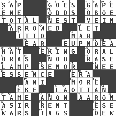 ACROSS 1. Plant excrement 4. Travels 8. Yawn 12. Compass dir. 13. Probability 14. Mitch Miller's instrument 15. Add up to 18. Egg locale 19. Distinctive style or manner 20. Moved like an arrow 22. Allow 23. "Tell ____ the Marines!" 24. Spoil 25. Hearing organ 26. Normal relaxed breathing 30. Floor protector 33. Supplementing with great effort 36. Of the mouth 37. Mouths or openings 39. Dreamland 40. Raze (variant) 41. Desk light 42. Sir (Sp.) 44. Born 45. Substance 47. Epoch 50. Cuckoo 51. Greater amount 53. Supplement with great effort 54. Of or relating to Laos or its people 57. Docile 59. At once, immediately (arch.) 61. Composer Copland 63. SW Saudi Arabia district 64. Monthly bill 65. Compass dir. 66. Armed conflicts 67. Labels 68. Morning condensation DOWN 1. Put into a specified state 2. Small Philippine buffalo 3. _ dish (used to culture cells) 4. Went 5. Wrote a lyric poem 6. Begley and Asner 7. Fast jet (abbr.) 8. State head 9. Collude with 10. Luau course 11. Car or cant ending 16. Johnson of "Laugh-In" 17. Globular water bottle used in Asia 21. Had on 22. Infant locale 24. Large cup 26. Inside; within (prefix) 27. NW Algerian seaport 28. Comfort 29. Toward shelter 30. Undercover agent 31. Caspian sea tributary 32. Scottish caps 34. Leg joint 35. Electrically charged atom 38. Orators 42. _-fi 43. San ____ (Riviera town) 46. Compass dir. 48. Roll call or roster of names 49. Roberta Peters solo 52. Having ears or earlike features 53. Independent ruler or chieftain 54. Protracted 55. Pismires 56. Sense of smell 57. The 23rd letter of the Hebrew alphabet 58. White ___ sheet 59. Tate display 60. Teachers' org. 62. ___ Haven, CT