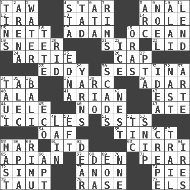 ACROSS 1. The 23rd letter of the Hebrew alphabet 4. Play the lead 8. Of or related to the anus 12. Lyricist Gershwin 13. Jacques of French films 14. Hero or heavy, e.g. 15. Remaining after all deductions 17. First of billions? 18. Sea 19. Scornful expression 21. Title for a knight 23. Flaplike covering 24. Nick name for Arthur 26. Head covering 28. Whirlpool 30. French poetic form 34. Keyboard key 37. Drug cop 39. The sixth month of the Jewish calendar 40. In the manner of 41. Believer in; advocate of (suffix) 43. Eastern Standard Time (abbr.) 44. Ubangi River tributary 46. Thickened enlargement 47. Had dinner 48. Winter's stalactites 51. Fast planes 54. Clumsy lout 55. Tinged 58. Impair 61. It would 63. High-altitude cloud 65. Bee-related 67. Locale of original sin 71. Lightbulb-shaped fruit 72. Simple or foolish person 73. Soon (poet.) 74. Sliced dessert 75. Pulled tight 76. To erase 77. Raised railways DOWN 1. Airtight sealed metal containers 2. Sports stadium 3. Wetness 4. R.R. building 5. Bit 6. _ moment's notice (2 wds.) 7. Basketball hoops 8. Curve 9. Christmas carol 10. Jai ____ 11. Grant temporary use of 16. Wig 18. Mouths or openings 20. To free from 22. Frozen water 25. Pulitzer Prize-winning author Ferber 27. Parent Teacher Assoc. 29. Entertaining tales 30. Heaps 31. The main thing one is thinking about 32. Political cartoonist Thomas 33. Johnson of "Laugh-In" 34. "Change" in Tahitian 35. Actor Baldwin 36. Indonesian resort city 38. River (Sp.) 42. Egg locale 45. Environmental prefix 49. (Had) reclined 50. Lizard (obsolete) 52. Nervous spasm 53. Clip 56. Streamer paper 57. Lag or linger behind 58. Vertical spar for supporting sails 59. Capital of Western Samoa 60. Tall New Zealand timber tree 62. Letter starter 64. Angers 66. Fitting 68. Heredity factor (abbr.) 69. Greek goddess of the dawn 70. Compass dir.