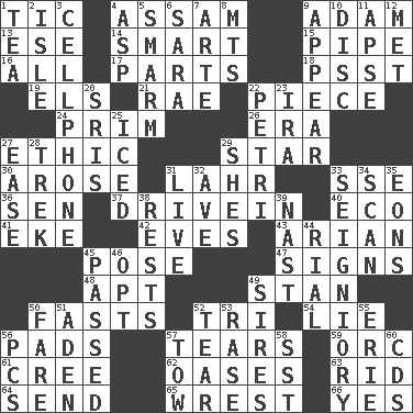 ACROSS 1. Nervous spasm 4. Indian state 9. First of billions? 13. Compass dir. 14. Don Adams' spy role 15. Corncob 16. 100% 17. Pieces 18. Inconspicuous attention getter 19. Raised railways 21. Actress Charlotte 22. Part 24. Demure 26. Epoch 27. Value system 29. Play the lead 30. Came up 31. Cowardly lion portrayer 33. Compass dir. 36. Elected rep. 37. Popular '50s hangout 40. Environmental prefix 41. Make supply last 42. Nights before holidays 43. Believer in; advocate of (suffix) 45. Airs 47. Attaches a signature 48. Fitting 49. Comedian Laurel of Laurel & Hardy 50. Goes without food and/or water 52. Three (prefix) 54. Falsehood 56. Writing tablets 57. Separates forcefully 59. The grampus (Milton) 61. Algonquian 62. Fertile tracts in a desert 63. To free from 64. Transmit 65. Obtain by seizing forcibly or violently 66. Affirmative reply DOWN 1. Beverage made from leaves 2. Small island 3. Portable communications device 4. Cleo's killer 5. Excessive but superficial compliments 6. "Two Mules for Sister ____" 7. Johnson of "Laugh-In" 8. Mountains (abbr.) 9. Seem 10. Plate 11. Domed church section 12. Was introduced to 20. Indian titles of respect 22. _ dish (used to culture cells) 23. Retirement account (abbr.) 25. On the rocks 27. Comfort 28. Long journey 29. "______ My Girl" (Turtles hit) 31. Not recorded 32. "___ Maria" 33. Signiory (variant) 34. Examine minutely or intensely 35. Immeasurably long periods of time 38. Musical pauses 39. Political cartoonist Thomas 44. Monetary unit of Yemen 45. Went by 46. Elect 49. Titles for men of rank and authority 50. Conductor's collection 51. Arabian gulf 52. Pull apart 53. Raze (variant) 55. 4th largest of the Great Lakes 56. Personal Computers (abbr.) 57. Pull behind 58. Fast jet (abbr.) 60. Music discs