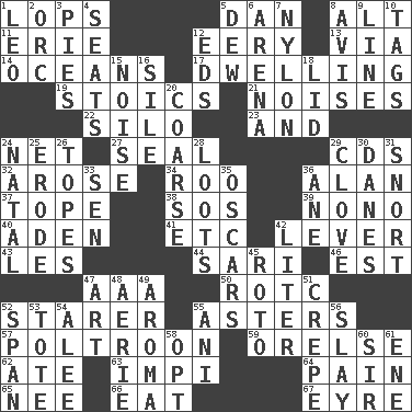 ACROSS 1. Chops off 5. Daniel's nick name 8. Keyboard modifier key 11. One of the Great Lakes 12. Suggestive of the supernatural 13. By way of 14. Seas 17. Home 19. Unemotional ones 21. Annoying sounds 22. Grain storage tower 23. Added to 24. Fish or hair follower 27. Lick closed 29. Music discs 32. Came up 34. Friend of Pooh 36. Actor Alda or Thicke 37. Drink excessively 38. Distress signal 39. Words to Nanette 40. An important port of Yemen 41. And so on (abbr.) 42. Prying instrument 43. French article 44. Indian skirt 46. Eastern Standard Time (abbr.) 47. American Automobile Association (abbr.) 50. College mil. group 52. A viewer who gazes fixedly 55. Michaelmas daisies 57. Characterized by complete cowardliness 59. Threatening words 62. Had dinner 63. Body of Kaffir warriors 64. Ache 65. Born 66. Ingest 67. Jane of fiction DOWN 1. Lion 2. The grampus (Milton) 3. Sliced desserts 4. Theater features 5. Morning condensation 6. Sports stadium 7. Thermoplastic polyamide 8. Opinion 9. Actor's bit 10. Labels 12. Begley and Asner 15. Annoying sound 16. Drop; flow; fall 18. Hat (slang) 20. Unrefined 24. Relating to or accompanying birth 25. Wear away 26. Drinks excessively 28. Plunders 29. Garlic unit 30. Natives or inhabitants of Denmark 31. Derisive sound 33. Elected rep. 35. Motion picture awards 36. A saturated hydrocarbon 42. 61 cubic inches 45. Printing process, for short 47. Nonscientific branch of learning 48. Nest on high 49. Odor 51. Streamer paper 52. Connect, as a bridge 53. Carryall 54. Toward shelter 55. Cuckoo 56. Kill 58. Elect 60. Title for a knight 61. Compass dir.