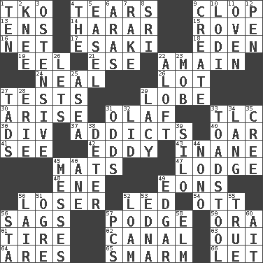 ACROSS 1. Ring climax 4. Lacerates 9. Hoof sound 13. Followers of ems 14. Ethiopian city, capital of Harari 15. Be footloose 16. Fish or hair follower 17. 1973 Nobel Price Winner (Physics) Leo 18. Genesis locale 19. Snakelike fish 21. Compass dir. 22. At full speed 24. Actress Patricia 26. Car dealer's back yard 27. Trials 29. Ear part 30. Originate 31. Norwegian king 33. Affectionate concern, for short 36. HTML Container Element 37. Inveterate users 40. Rowing implement 41. Observe 42. Whirlpool 43. Lacking in sense or substance 45. Floor protectors 47. Cabin 48. Compass dir. 49. Immeasurably long periods of time 50. Failure 52. Directed 54. Baseball player Mel 56. Settles 57. Plash 59. Mouth or opening 61. Become fatigued 62. Lessep's creation 63. Fr. "Yes" 64. Ancient Greek god of war 65. Excessive but superficial compliments 66. Allow DOWN 1. Nine, plus one 2. Leg joint 3. Clearly or manifestly demonstrative 4. Definite Article 5. Artist's stand 6. Caspian sea tributary 7. Libertine 8. Indian title of respect (Mr.) 9. Cause to be 10. Farming town in central California 11. Baking chamber 12. Writing instrument 20. Allows 22. High up in or into the air 23. Disorderly crowd 25. At sea 27. Bits 28. 4th largest of the Great Lakes 29. Made of lace 31. Likelihood 32. Hat (slang) 33. Inedible or poisonous agaric 34. Austrian-born American filmmaker Fritz 35. Algonquian 38. Prevent from occurring 39. Grain storage tower 44. Words to Nanette 45. Makes clutter 46. A saturated hydrocarbon 49. _ Allan Poe 50. Den 51. Legendary monster 52. Rich soil 53. Pulitzer Prize-winning author Ferber 55. Loyal 56. R.R. building 57. Personal Computers (abbr.) 58. Shade tree 60. Small island