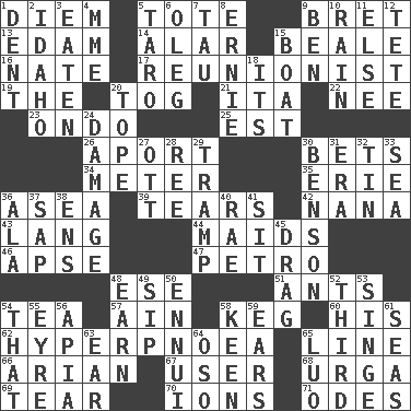 ACROSS 1. South Vietnam president (1954) 5. Haul 9. Cy Young winner Saberhagen 13. Dutch treat 14. Having or resembling wings 15. Memphis, Tenn. Street 16. Nathan's nickname 17. One who advocates reunion 19. Definite Article 20. Coat; cloak 21. Call ___ day 22. Born 23. Southwest Nigerian state 25. Eastern Standard Time (abbr.) 26. To the left, to Queeg 30. Antes 34. Distance measurement 35. One of the Great Lakes 36. At sea 39. Pulls into pieces 42. Nanny 43. Long (Scottish) 44. Unmarried girls 46. Domed church section 47. Stone: prefix 48. Compass dir. 51. Pismires 54. Afternoon social gathering 57. The 18th letter of the Arabic alphabet 58. Barrel 60. Part of HMS, perhaps 62. Abnormally rapid or deep breathing 65. Actor's bit 66. Believer in; advocate of (suffix) 67. One who makes use of a thing 68. Capital and largest city of Mongolia 69. Separate forcefully 70. Charged particles 71. Lyric poems DOWN 1. Incision 2. Potato state 3. Ingested 4. Madame (abbr.) 5. Pacific island yam 6. Cassini of fashion 7. The 19th letter of the Greek alphabet 8. Bert's buddy 9. Benjamin's nick name 10. Water falling in drops from the sky 11. Otherwise 12. Wig 15. Water vessel 18. ___ a Wonderful Life 20. Drink excessively 24. Break 27. Baseball player Mel 28. Portuguese money of account (variant) 29. _____ steamer (cargo ship) 30. Gillaume's butler role 31. Period 32. Shallow baking pan 33. Ocean 36. Insect wing 37. Plant excrement 38. Followers of ems 40. Actress Charlotte 41. Be seated 45. To draw with force 48. Merit 49. Small drink 50. World-weariness 52. One of three equal parts 53. Burn superficially 54. Not this but _ 55. Jane of fiction 56. Capital of Western Samoa 58. Peachy ____! 59. Hearing organs 61. Oceans 63. Hearing organ 64. Bear (Spanish) 65. Nilotic language