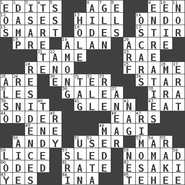ACROSS 1. Proofreads 6. Grow older 9. Car or cant ending 12. Fertile tracts in a desert 13. Land elevation 14. Southwest Nigerian state 15. Don Adams' spy role 16. Lyric poems 17. Commotion 18. Before (prefix) 19. Actor Alda or Thicke 20. Land measure 21. Not wild 23. Actress Charlotte 24. Western Nevada city 25. Movie unit 28. "We ___ not amused" (Victoria) 30. Keyboard key 34. Play the lead 35. French article 36. An organ shaped like a helmet 38. Retirement account (abbr.) 39. In a ____ (agitated or irritated) 41. American astronaut and politician John 43. Ingest 44. More peculiar 46. Hearing organs 48. Compass dir. 49. Wise men 50. Actor Griffith 51. One who makes use of a thing 53. Third mo. 56. Louse (plural) 57. Downhill vehicle 58. Roamer 60. Wrote a lyric poem 61. Pace 62. 1973 Nobel Price Winner (Physics) Leo 63. Affirmative reply 64. _ tizzy (2 wds.) 65. Giggle DOWN 1. Greek goddess of the dawn 2. Moist 3. Austrian river, tributary to the Danube 4. Cigar-shaped 5. Fast jet (abbr.) 6. Opera by Verdi 7. Small, secluded valley 8. Raised railways 9. Pleas 10. Singer Brickell 11. Not either 13. Opening into or through something 14. Motion picture awards 19. Amid 20. Sandy's bark 22. One (Scot) 24. Homes 26. Hindu Mythology: god of death 27. Part of Q.E.F. 28. In addition 29. Tear apart 31. Label 32. Pipe bend 33. To sift 37. Approach 40. Watched over 42. Tired old horse 45. Marina Del _, California 47. Full of chinks, cracks, or crevices 49. Ancient Persian 50. Assistant 51. Uhlan (variant) 52. Bristle 54. Nanny 55. Libertine 56. Myrna of the movies 57. Indian title of respect (Mr.) 58. Fish or hair follower 59. Pass on