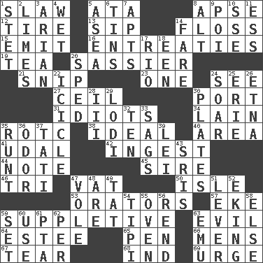 ACROSS 1. Cole _ (cabbage dish) 5. "One Day ___ Time" 8. Domed church section 12. Become fatigued 13. Small drink 14. Soft thread for cleaning between teeth 15. Send forth 16. Pleas 19. Beverage made from leaves 20. More lively and spirited 21. Clip 23. Single 24. Observe 27. To provide with a ceiling 30. Left side of a ship or aircraft 31. Foolish or stupid persons 34. (Had) reclined 35. College mil. group 38. Standard of perfection 40. Length times width 41. Allodial 42. Eat 44. Observe 45. The founder of a family 46. Three (prefix) 47. Large container 50. Capri or Wright 53. Speakers 57. Make supply last 59. Supplementary 63. Morally bad or wrong 64. First name in cosmetics 65. Writing instrument 66. Not women's 67. Lacerate 68. Indiana (abbr.) 69. Goad DOWN 1. Proofreading order 2. Citrus fruits 3. Believer in; advocate of (suffix) 4. Dripping 5. Toward the sea 6. Metal containers 7. Flats, for short 8. Keyboard modifier key 9. Luau course 10. Compass dir. 11. Curvy letter 14. Conductor's collection 17. River (Sp.) 18. Car or cant ending 20. Moved rapidly 22. Ice on the eave 24. Fly high 25. 4th largest of the Great Lakes 26. Inactive volcano in Sicily 28. One more than two 29. Farming town in central California 30. Food holders 32. "___ Little Indians" 33. Sinks 35. Undersized animal 36. Aroma 37. Jacques of French films 39. Flowery wreath 43. Indian titles of respect 47. Short-tailed, large-bodied rat 48. "We ___ not amused" (Victoria) 49. Make lace 51. Prying instrument 52. Supplementing with great effort 54. Native american tent (variation) 55. Baking chamber 56. Tear apart 58. Otherwise 59. Arrange properly for use 60. Purpose 61. Parent Teacher Assoc. 62. For each 63. Australian flightless bird