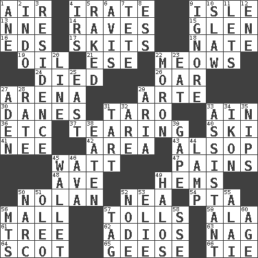 ACROSS 1. Wind 4. Feeling or showing extreme anger 9. Capri or Wright 13. Compass dir. 14. All-night dance parties 15. Small, secluded valley 16. Begley and Asner 17. Burlesque acts 18. Nathan's nickname 19. Lubricate 21. Compass dir. 22. Catcalls? 24. Passed on 26. Boat paddle 27. Sports stadium 29. Johnson of "Laugh-In" 30. Natives or inhabitants of Denmark 31. Pacific island yam 33. The 18th letter of the Arabic alphabet 36. And so on (abbr.) 37. Separating forcefully 40. What Jean-Claude Killy likes to do 41. Born 42. Type of rug 43. Columnist Joseph or Stewart 45. Electrical Unit 47. Aches 48. "___ Maria" 49. Is hesitant and indecisive 50. Pitcher Ryan 52. Teachers' org. 54. Parent Teacher Assoc. 56. Promenade 57. For Whom the Bell _____ 59. Chicken ___ king 61. Relationship diagram 62. Goodbye (Sp.) 63. Tired old horse 64. Highlander 65. Honkers 66. Standoff DOWN 1. One (Scot) 2. Southeast Asian peninsula 3. Dwelling 4. Big collection agency 5. Swept the length of 6. Opinion 7. False hair 8. Curvy letter 9. Snub 10. Cole _ (cabbage dish) 11. Allows 12. Compass dir. 20. Actor's bit 22. Person of subnormal intelligence 23. Erode 25. Compass direction 27. An important port of Yemen 28. Pace 29. Operatic vocal solo 31. Small pie 32. "We ___ not amused" (Victoria) 33. Helper 34. Visual representation of an object 35. Cuts off 38. Consumed 39. Open wide 44. Desk light 45. Place for singles 46. Actress Gardner 49. Rings 50. Drug cop 51. Butter sub 52. Connecting point 53. Writer Wiesel 55. Mountain range southwest of Kyrgyzstan 56. Mountains (abbr.) 57. Label 58. Compass dir. 60. Grow older