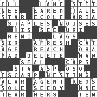 ACROSS 1. Pipe bend 4. Unable to walk 8. Proofreading order 12. Born 13. Having ears or earlike features 14. Lie 15. Play the lead 17. Learning spot: Fr. 18. Operatic vocal solo 19. Paper fasteners 21. Annoying sounds 23. Part of HMS, perhaps 24. Perceive with the eye 26. RI univ. 27. Painter Guido (1575-1642) 28. Straggles 30. Title for a knight 31. Anew 34. Domesticated feline 37. Grow older 38. Arrive at 39. Mouth or opening 40. Groovy apt. 41. Keyboard key 42. Informal term for the mouth 43. Lick closed 44. Balmoral and tarboosh 46. R.R. building 47. Viper 50. Bear (Spanish) 51. Fortification 54. Nestling 57. Having or resembling wings 58. Representative 60. Vintage cars 62. Not divided or shared with others 63. Full of seeds 64. Compass dir. 65. Separate forcefully 66. Possessive pronoun 67. "___ Little Indians" DOWN 1. Followers of ems 2. Allows 3. Tough but pliablecoriaceous 4. Shoestrings 5. Came up 6. Cartoonist voice _ Blanc 7. Paradise 8. Flight of steps 9. Tarsus (plural) 10. Writer Wiesel 11. Beverages made from leaves 13. Snakelike fish 16. Water falling in drops from the sky 20. Air pressure measure (abbr.) 22. Ending for "Through" and "Enough" 25. Choose 27. Port city in Latvia 29. American tennis player Robert 30. Plant excrement 31. Type of rug 32. Man or boy (slang) 33. Actress Charlotte 34. Piece 35. Caspian sea tributary 36. The 23rd letter of the Hebrew alphabet 41. Letter starter 43. A viewer who gazes fixedly 44. Small bed 45. SW Saudi Arabia district 46. Any of the three canals of the cochlea 48. Scornful expression 49. Depends 51. Compass direction 52. _ gin 53. Romantic infatuation 55. Filthy place 56. Went 59. Unit of force equal to gravity 61. Elected rep.