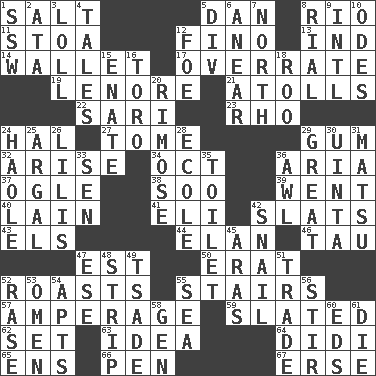 ACROSS 1. Table seasoning 5. One of the 12 tribes of Israel 8. River (Sp.) 11. Portico 12. A pale, very dry sherry 13. Indiana (abbr.) 14. Place for singles 17. Make much ado about nothing 19. Poe poem 21. Ringlike coral islands and reefs 22. Indian skirt 23. 17th letter of the Greek alphabet 24. Actor Linden 27. Heavy book 29. Chewing product 32. Get up 34. Sep. follower 36. Roberta Peters solo 37. Stare at amorously 38. "Barney Miller" actor Jack 39. Gone 40. (Had) reclined 41. Biblical high priest 42. Narrow boards 43. Raised railways 44. Flair 46. The 19th letter of the Greek alphabet 47. Eastern Standard Time (abbr.) 50. Part of Q.E.F. 52. Cooks with dry heat, as in an oven 55. Flight of steps 57. Electrical Measurement 59. Scheduled 62. Put into a specified state 63. It may be bright or harebrained 64. "You Light Up My Life" star Conn 65. Followers of ems 66. Writing instrument 67. Celtic language DOWN 1. Compass dir. 2. _ moment's notice (2 wds.) 3. Hang loosely or laxly 4. Stories 5. HTML Container Element 6. Approach 7. _ pole 8. Monetary unit of Yemen 9. International (abbr.) 10. Lyric poems 12. Enemy 15. Related on the mother's side 16. "Corrida" creature 18. Friend of Pooh 20. Full of chinks, cracks, or crevices 24. White Person, in Hawaii 25. Therefore, facetiously 26. Ms. Damita and namesakes 28. Learning spot: Fr. 29. Relatively large 30. National forest in Provo, Utah 31. Taiwanese island in East China Sea 33. Elected rep. 35. Bathroom plumbing fixture 36. Leather borer 42. Slow-paced one 45. Caspian sea tributary 47. Compass dir. 48. Empty completely 49. Sadhe (variant) 51. Barter 52. To erase 53. Sign of something about to happen 54. Flats, for short 55. Ocean 56. Use a spoon 58. Commissioned military rank (abbr.) 60. Begley and Asner 61. Expire