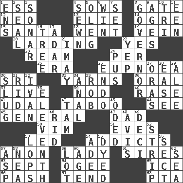 ACROSS 1. Curvy letter 4. Sty mamas 8. Yard entry 12. Modern: prefix 13. Writer Wiesel 14. Legendary monster 15. Before Barbara or Clara 18. Left 19. Distinctive style or manner 20. Preparing or cooking with lard 22. Affirmative reply 23. 480, 500 or 516 sheets of paper 24. For each 25. Period 26. Normal relaxed breathing 30. _ Lanka 33. Tall tales 36. Taken by mouth 37. Not recorded 39. Dreamland 40. To erase 41. Freehold land 42. Off limits 44. Observe 45. Commissioned military rank 47. June honoree 50. Zeal 51. Nights before holidays 53. Directed 54. Inveterate users 57. Soon (poet.) 59. Kenny Rogers chart-topper in '80 61. Begets 63. Back-to-school mo. 64. Double curve, resembling the letter S 65. Frozen water 66. Romantic infatuation 67. Be inclined (to) 68. Parent Teacher Assoc. DOWN 1. Followers of ems 2. Lick closed 3. Underwater navigation system 4. Stitched 5. Cassini of fashion 6. Victory 7. Arrange properly for use 8. State head 9. Eons 10. Three (prefix) 11. Car or cant ending 16. Woody plant 17. The sixth month of the Jewish calendar 21. "If ____ say so..." 22. Slangy assent 24. Purulenc 26. Inside; within (prefix) 27. Mouths or openings 28. Comfort 29. Toward shelter 30. A hard, heavy blow 31. Travel on or in a vehicle 32. "Terrible" tsar 34. Of or related to the anus 35. Director Reiner 38. Veterans Day date 42. Scottish cap 43. Wrote a lyric poem 46. To free from 48. Opinion 49. Tenth: prefix 52. Long narrow piece of something 53. Chops off 54. An important port of Yemen 55. Colored 56. Religious group 57. Cleo's killer 58. Teachers' org. 59. Car dealer's back yard 60. Grow older 62. Ocean