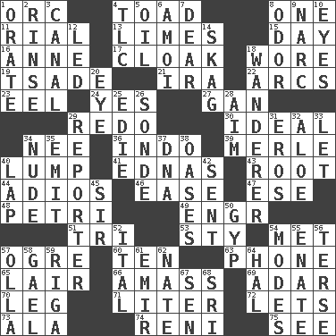ACROSS 1. The grampus (Milton) 4. Frog relative 8. Single 11. Monetary unit of Yemen 13. Citrus fruits 15. 24 hours 16. Singer Murray 17. Cover or conceal 18. Had on 19. Sadhe (variant) 21. Retirement account (abbr.) 22. Arches 23. Snakelike fish 24. Consenting reply 27. Separate the seeds from cotton 29. Do over again 30. Standard of perfection 34. Born 36. _ china 39. Haggard of country music 40. Mass 41. Ferber et al. 43. Carrot, for example 44. Goodbye (Sp.) 46. Relaxation 47. Compass dir. 48. _ dish (used to culture cells) 49. Engineer (abbr.) 51. Three (prefix) 53. Filthy place 54. Was introduced to 57. Legendary monster 60. Nine, plus one 63. Give a jingle 65. Den 66. Collect or gather 69. The sixth month of the Jewish calendar 70. Part of a journey 71. 61 cubic inches 72. Allows 73. Insect wing 74. Painter Guido (1575-1642) 75. Perceive with the eye DOWN 1. Declaim 2. Remove soap 3. Lessep's creation 4. Affectionate concern, for short 5. Lubricate 6. Mine, in Marseilles 7. Letter starter 8. Scent 9. Drug cop 10. Sight organs 12. Directed 14. Heroin 18. Nomad 20. Sight organ 25. Singer Brickell 26. Message 28. Direct toward a target or goal 29. Newsperson 31. Greek god of love 32. _ vera 33. Allow 34. Unadorned 35. Give off 37. Heredity factor (abbr.) 38. Fertile tracts in a desert 40. Pet locale 42. Transmitted 45. Title for a knight 50. Hustle 52. Slanted text style (abbr.) 54. Methods 55. Related on the mother's side 56. Laconic 57. Spanish pot 58. Highlander 59. Port city in Latvia 61. Independent ruler or chieftain 62. Nathan's nickname 64. Actor Linden 67. Elected rep. 68. Indian title of respect (Mr.)