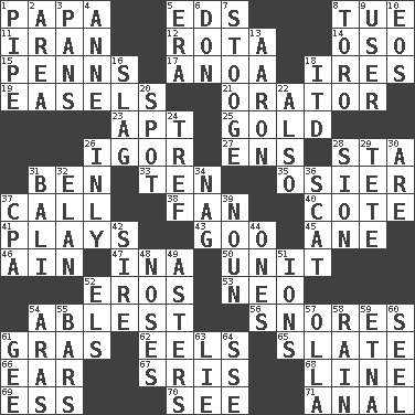 ACROSS 1. Dad 5. Begley and Asner 8. Third day of the wk. 11. SW Asia republic 12. Round or rotation of duties 14. Bear (Spanish) 15. Actor Sean's family 17. Small Philippine buffalo 18. Angers 19. Artist's stands 21. Speaker 23. Fitting 25. Aureate 26. Russian composer Stravinsky 27. Followers of ems 28. R.R. building 31. Benjamin's nick name 33. Nine, plus one 35. Flexible twig of a willow tree 37. Give a ring to 38. Air blower 40. ____ d'Azur (French Riviera) 41. Live dramatic performances 43. Thick or sticky substance 45. One (Scot) 46. The 18th letter of the Arabic alphabet 47. _ tizzy (2 wds.) 50. A single undivided whole 52. Greek god of love 53. Modern: prefix 54. Most capable 56. Sounds asleep 61. Pate de foie ____ 62. Snakelike fish 65. Schedule 66. Hearing organ 67. Indian titles of respect 68. Actor's bit 69. Curvy letter 70. Perceive with the eye 71. Of or related to the anus DOWN 1. Corncob 2. Length times width 3. Zero-star reviews 4. Singer Murray 5. Epoch 6. Spanish title 7. Moe Howard, for one 8. "Corrida" creature 9. One who makes use of a thing 10. Greek goddess of the dawn 13. Composer Copland 16. Volcanic refuse 18. It would 20. Specific locale 22. In addition 24. Not kosher 26. In an inward manner 28. The Jewish people; Israel 29. False hair 30. "We ___ not amused" (Victoria) 31. Indonesian resort city 32. Liveliness 34. Tired old horse 36. Scram, to a cat 37. Numbers guy (abbr.) 39. Part of speech 42. Male parent of an animal 44. Singles 48. Olfactory organs 49. Michaelmas daisies 51. Charged particles 52. Raised railways 54. Caspian sea tributary 55. Soap units 57. Spanish pot 58. Water falling in drops from the sky 59. Inactive volcano in Sicily 60. Stitch closed the eyes of (a falcon) 61. Turn to the right 63. Falsehood 64. Compass dir.