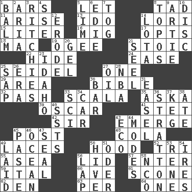 ACROSS 1. Soap units 5. Allow 8. Small boy 11. Originate 13. Wedding promise 14. Australian parrot (variant) 15. 61 cubic inches 16. Russian fighter aircraft 17. Chooses 18. Apple computer (short form) 19. Double curve, resembling the letter S 21. Unemotional 22. Flintstone garb 24. Comfort 25. Beer mug 27. Single 29. Length times width 30. The Good Book 32. Romantic infatuation 33. Any of the three canals of the cochlea 35. "____ silly question..." 39. Witty Wilde 41. Proofreading order 42. Title for a knight 43. Develop 45. Mail 48. Root beer relative 49. Shoestrings 50. Parka part 52. Three (prefix) 55. Toward the sea 56. Flaplike covering 57. Keyboard key 59. Slanted text style (abbr.) 60. "___ Maria" 61. Biscuitlike quick bread 62. Lair 63. For each 64. Washington bills DOWN 1. Lip ointment 2. Operatic vocal solo 3. Actors Guy, Robert Welles, and Clint 4. Compass dir. 5. Welles in "The Third Man" 6. Singer Brickell 7. Coat; cloak 8. Traditional theme or motif 9. Nick name for Arthur 10. Plate 12. Wear away 14. Globular water bottle used in Asia 20. Set 21. Stitch closed the eyes of (a falcon) 23. Potato state 25. Plant excrement 26. Epoch 27. Lubricate 28. Basketball assoc. 30. Long, evenly shaped piece 31. Artist's stand 33. _-fi 34. Automobile 36. Ski resort town in Vermont 37. Barrel 38. Had dinner 40. Fast planes 43. Environmental prefix 44. Methods 45. Thick mixture 46. Sea 47. Lick closed 49. Put down 50. Hub of activity 51. River in Europe 53. French philosopher Descartes 54. Angers 56. Pet locale 58. Non-commissioned officer (abbr.)