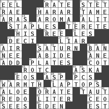ACROSS 1. Snakelike fish 4. Assign a rank or rating to 8. Proofreading order 12. Actress Charlotte 13. Ethiopian city, capital of Harari 14. Not wild 15. Ancient river in northeast Turkey 17. Odor 18. Came down and settled, as after flight 19. Paper fasteners 21. Cylindrical with tapered ends 23. Part of HMS, perhaps 24. To sift 26. French article 27. Tenth: prefix 28. One who doesn't tell the truth 30. Wind 31. Titan orbits this 34. Forbid 37. Born 38. Remain 39. A saturated hydrocarbon 40. Find the sum of 41. Food holders 42. Small bed 43. College mil. group 44. "____ silly question..." 46. Greek goddess of the dawn 47. Viper 50. Personal Computers (abbr.) 51. Heat 54. Portable computers 57. Medicinal plant 58. Speak pompously 60. Strained 62. Do over again 63. 61 cubic inches 64. Corporate head (abbr.) 65. Perceives with the eye 66. Genesis locale 67. Eastern Standard Time (abbr.) DOWN 1. Epoch 2. Hearing organs 3. Tough but pliablecoriaceous 4. Less widely known 5. Came up 6. Scottish cap 7. Part of Q.E.F. 8. A viewer who gazes fixedly 9. Stories 10. Give off 11. Wig 13. Actor Linden 16. Ketch in the Levant 20. Air pressure measure (abbr.) 22. Enthusiasm 25. Evade 27. Passed on 29. Angers 30. Santa ___, CA 31. Table seasoning 32. Phillipine bananalike plant 33. Teat (slang) 34. Keyboard key 35. Small Philippine buffalo 36. Fish or hair follower 41. Mail 43. Lover boys 44. Fitting 45. Native of Scotland 46. Wear away 48. Chalkboard 49. Eucharist need 51. Armed conflicts 52. Toward shelter 53. Opening into or through something 55. For each 56. Takes to court 59. To free from 61. Small child
