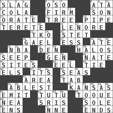 ACROSS 1. Volcanic refuse 5. Bear (Spanish) 8. _ moment's notice (2 wds.) 11. Root beer relative 12. Securely fixed in place 14. Male offspring 15. Declaim 17. Relationship diagram 18. Corncob 19. Cylindrical with tapered ends 21. Poe poem 23. Ring climax 25. Proofreading order 26. Highlander 27. Double-curved letter 28. Had dinner 31. Basketball assoc. 33. Lair 35. Rings 37. Ooze 38. Commissioned mil. rank 40. Nathan's nickname 41. Settings 43. Snakelike fish 45. Neckwear 46. Raised railways 47. ___ a Wonderful Life 50. Oceans 52. Type of rug 53. Bar bill 54. Most capable 56. Sunflower state 61. Send forth 62. Ballerina skirt 65. Woman's close-fitting hat 66. Teachers' org. 67. Indian titles of respect 68. Flatfish 69. Followers of ems 70. Compass dir. 71. Extremities DOWN 1. Native of Scotland 2. Old wives' tales, e.g. 3. Having or resembling wings 4. Yard entry 5. Often (poetically) 6. Title for a knight 7. Threatening words 8. SW Saudi Arabia district 9. Drink excessively 10. One (Scot) 13. Confronts 16. Singer James 18. Plant holder 20. Supplemented with great effort 22. Tender 24. Cassini of fashion 26. Stare wonderingly 28. Jai _ 29. Haul 30. Compass dir. 31. Famous astronaut Armstrong 32. Wagers 34. Born 36. Pismires 37. Compass dir. 39. Egg locale 42. Beget 44. Path through which fluid escapes 48. Trials 49. Titan orbits this 51. Blind as ____ 52. Keyboard modifier key 54. So be it 55. Prejudice 57. Olfactory organ 58. Within a short period 59. Old (Scot.) 60. Perceives with the eye 61. Compass dir. 63. Metal container 64. Purpose