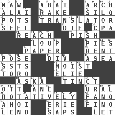 ACROSS 1. Informal term for the mouth 4. Blind as ____ 8. Bowlike part 12. Mountain range southwest of Kyrgyzstan 14. Libertine 15. Grain storage tower 16. Plant holders 17. Interpreter 20. Sew up the eyelids of hawks and falcons 21. Expire 22. Accounting whiz (abbr.) 23. Arrive at 27. Expression of disdain 29. Central Nebraska county 31. Sliced desserts 34. Some stationery 35. Monthly bill 36. Introduce or present, as a question 39. HTML Container Element 41. At sea 42. Fast planes 43. Damp 46. "Corrida" creature 47. Writer Wiesel 48. "____ silly question..." 51. Tinged 54. Baseball player Mel 56. One (Scot) 58. Mountain range 61. Producing rotation 66. Papal veil 67. Mine, in Marseilles 68. One of the Great Lakes 69. Fine (Spanish) 70. Grant temporary use of 71. Plant excrements 72. Allow DOWN 1. Atlas contents 2. Medicinal plant 3. Wetness 4. Tate display 5. Drinking establishment 6. Alias (abbr.) 7. Be inclined (to) 8. White ___ sheet 9. Actors Guy, Robert Welles, and Clint 10. Hoof sound 11. Israeli folk dance 13. Small island 18. Small drink 19. Luau accessory 24. Wing 25. Police officer (slang) 26. Became colored 28. Small fatty European fish 30. First class 32. Compass dir. 33. R.R. building 34. Mexican monetary units 36. Pacific Standard Time (abbr.) 37. Bear (Spanish) 38. Ski resort town in Vermont 40. Electrical Unit 44. One more than two 45. Elected rep. 49. Krazy ___ of comics 50. Cuckoo 52. Sleeve end 53. Hang back 54. Of the mouth 55. Heavy book 57. Nights before holidays 59. Queen of England 1702-14 60. Spoils 62. Assist 63. Epoch 64. Mouth edge 65. It is so